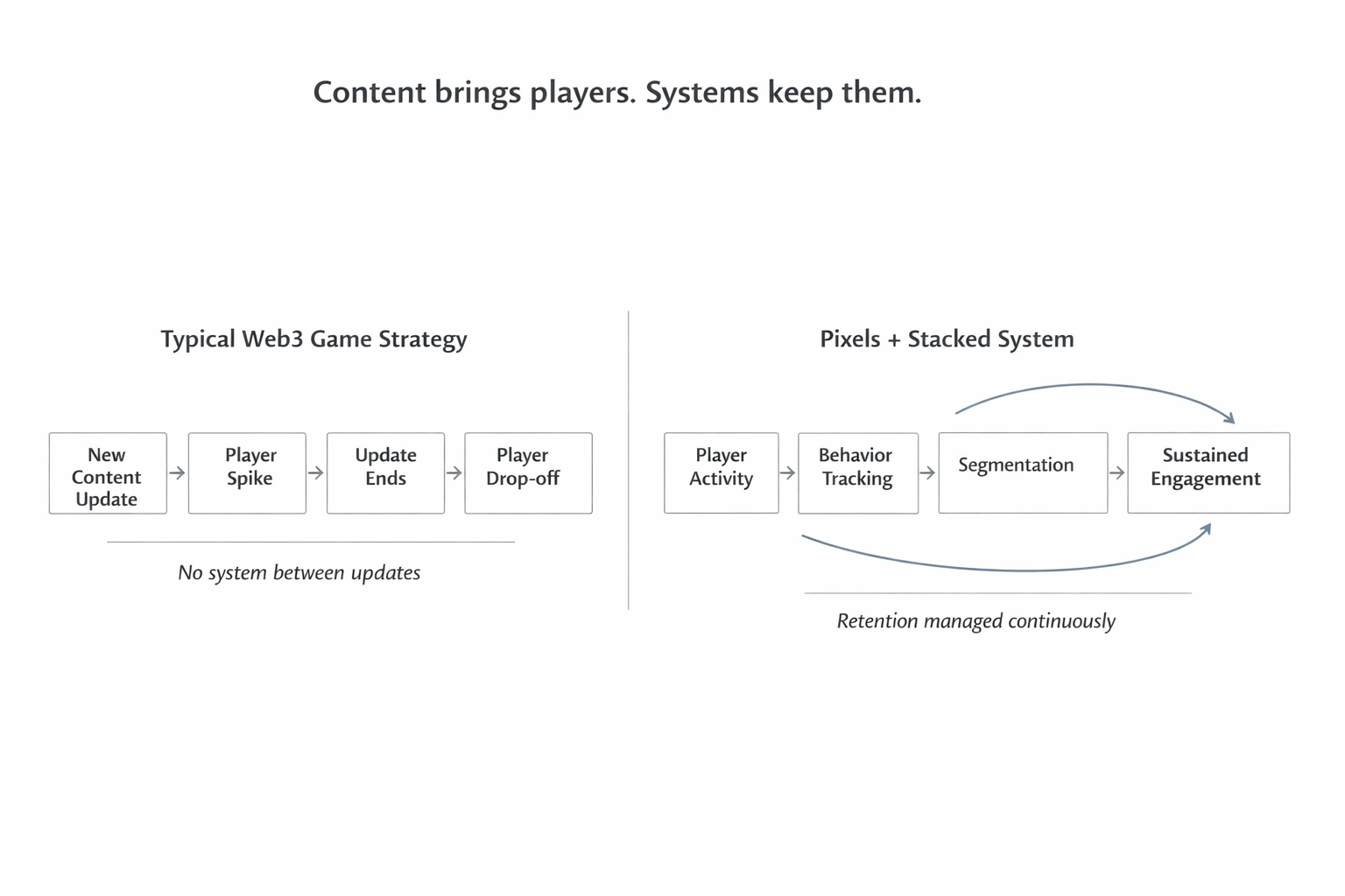 Pixels challenged that assumption directly. Because if you study how players actually behave inside a live game — not how you wish they behaved, but how they actually behave — the pattern that emerges is more specific and more actionable than "they leave when there's nothing new."