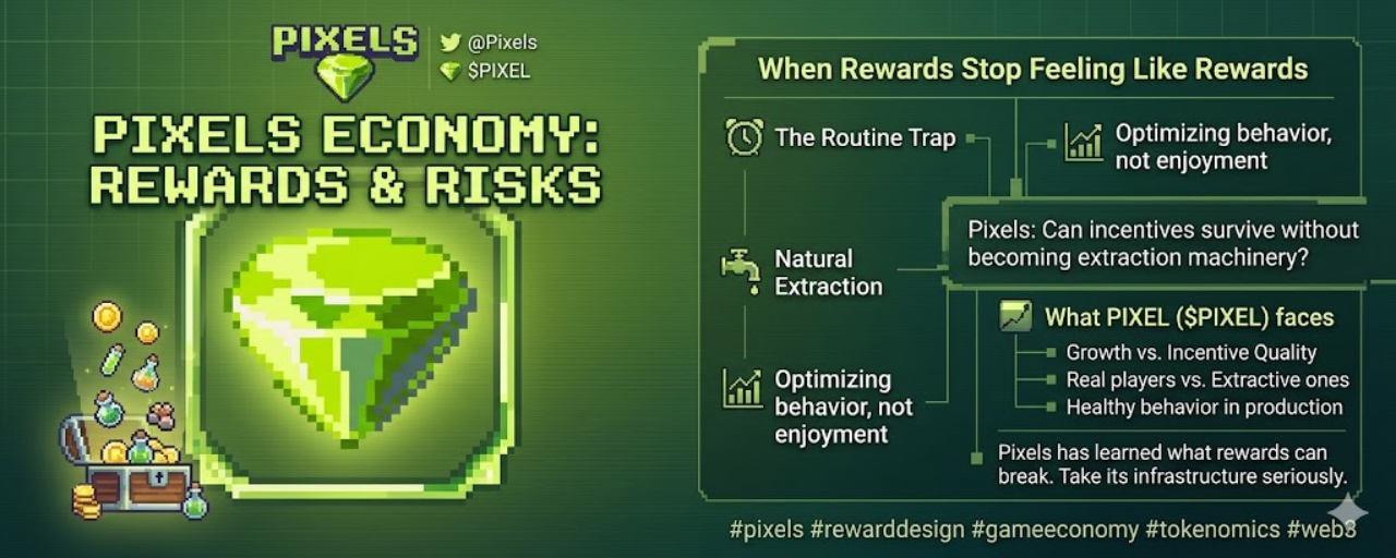 Điều làm cho Pixels đáng xem không phải là nó có phần thưởng. Hầu hết mọi dự án đều có phần thưởng. Mà là đội ngũ đã phải học những gì phần thưởng có thể bị hỏng khi chúng được chỉ vào hành vi sai.