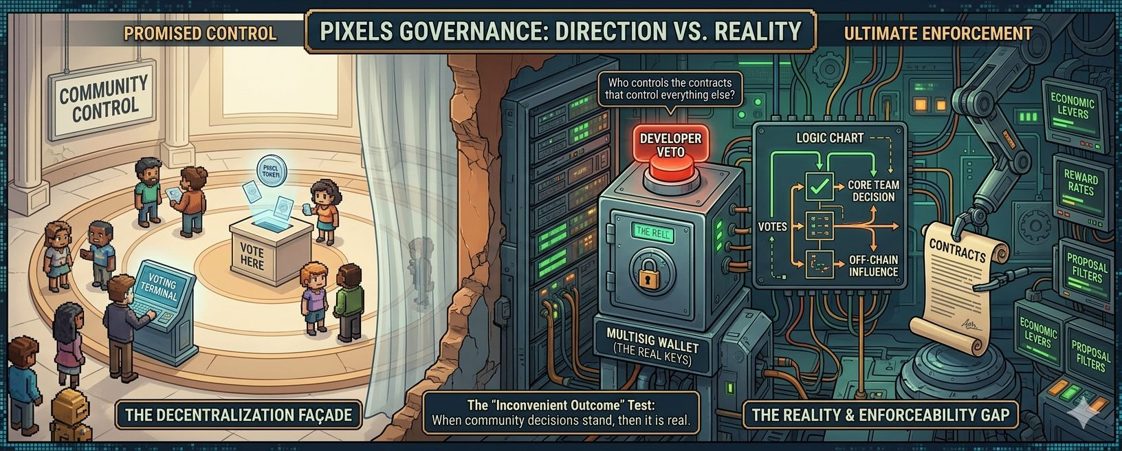 Pixels đang di chuyển theo hướng đó với sự quản lý gắn liền với token PIXEL. Trên lý thuyết, điều đó nghe có vẻ đúng. Những người nắm giữ token ảnh hưởng đến nền kinh tế, định hình nội dung và tham gia vào việc cân bằng hệ thống. Nó nghe giống như quyền sở hữu. Nhưng quản lý trong Web3 chưa bao giờ thực sự liên quan đến những gì được hứa hẹn. Nó liên quan đến những gì có thể thực thi khi các quyết định bắt đầu trở nên quan trọng.