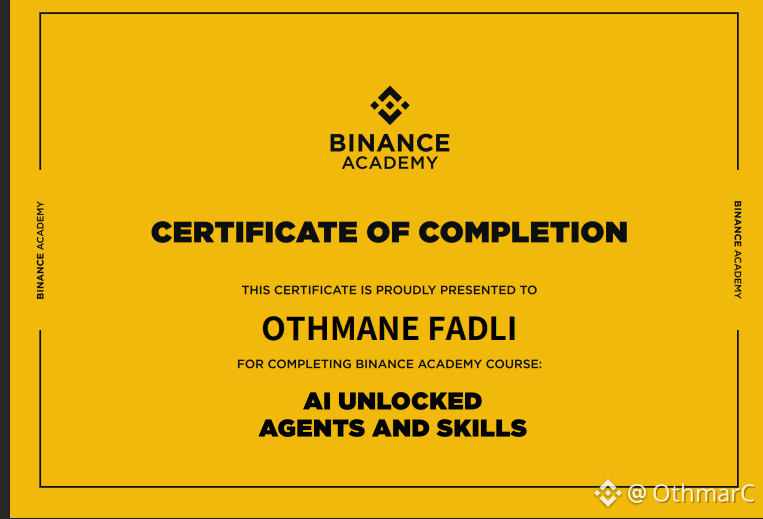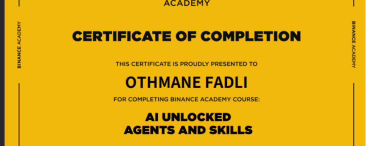 يسعدني أن أشارككم اليوم إنجازاً جديداً في مساري المهني والتعليمي، وهو حصولي على شهادة "AI Unlocked: Agents and Skills" المعتمدة من أكاديمية بينانس (Binance Academy).