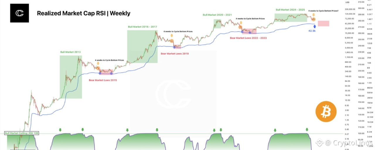 #Bitcoin Chỉ số RSI Vốn hóa Thực hiện trên khung thời gian hàng tuần một lần nữa đang tiến gần đến khu vực cấu trúc tương tự đã đánh dấu sự cạn kiệt chu kỳ trong lịch sử. Mỗi đáy thị trường gấu lớn vào các năm 2015, 2019 và 2022 chỉ hình thành vài tuần sau khi chỉ báo này đạt mức nén cực đoan, báo hiệu sự định giá thấp sâu sắc trên toàn mạng lưới.