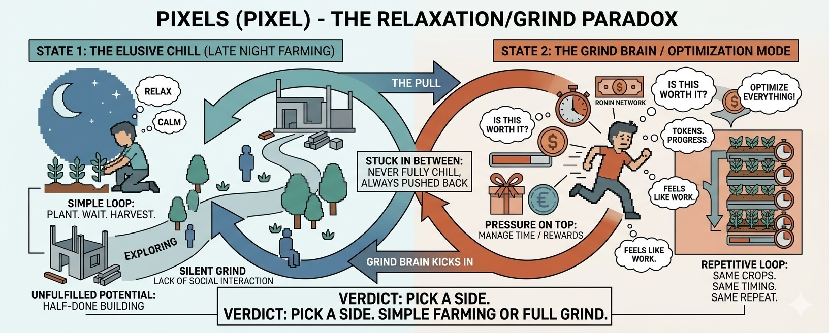 There are moments where it almost works. Late night. No pressure. Just farming. No thinking. Those moments are good.