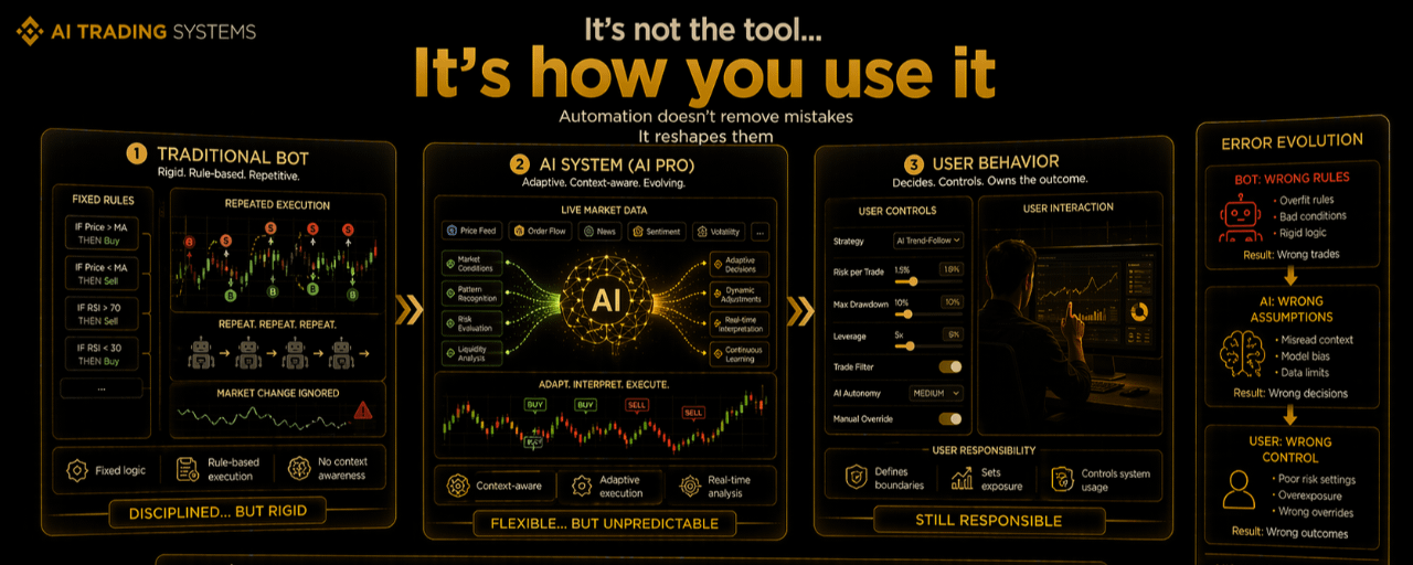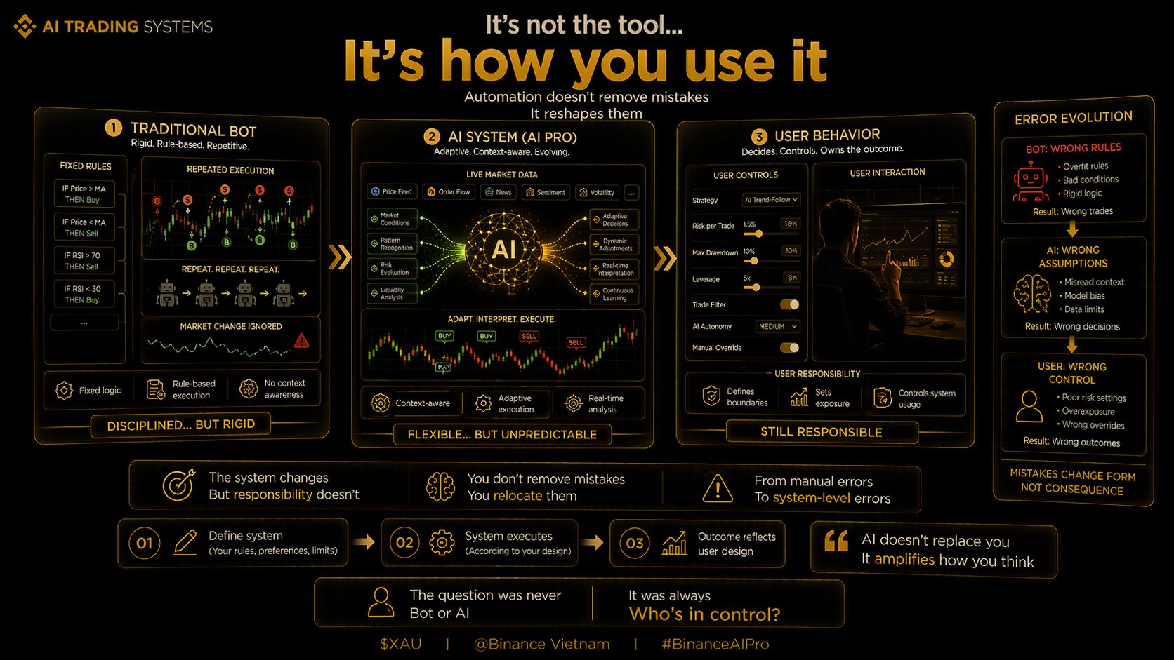 Nhiều người hay nhầm giữa kỷ luật và cứng nhắc. Bot rất kỷ luật… nhưng cũng rất cứng nhắc. Nó không hiểu context, không biết khi nào không nên trade. Condition match là execute. Và cứ thế, một chiến lược ban đầu có thể hợp lý… lại biến thành một chuỗi hành vi lặp lại ngay cả khi nền tảng đã thay đổi.