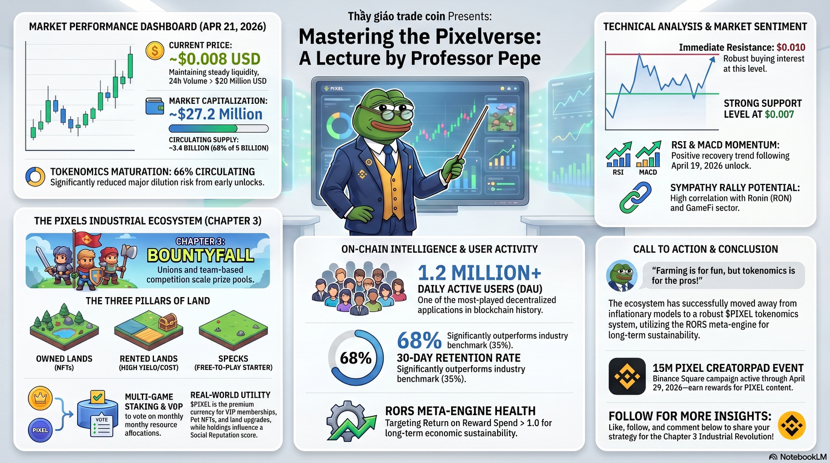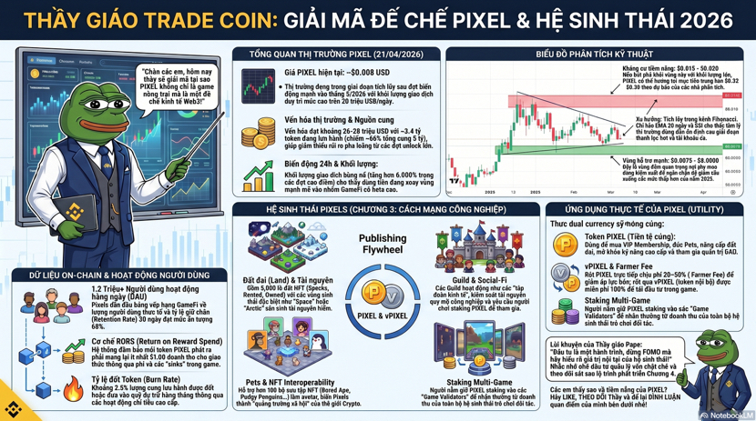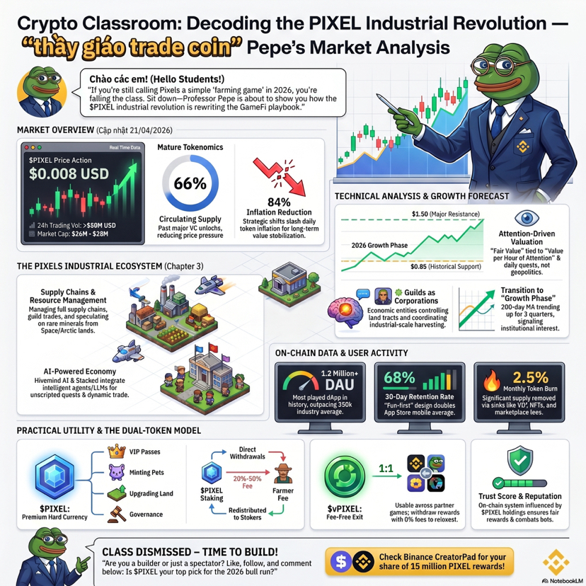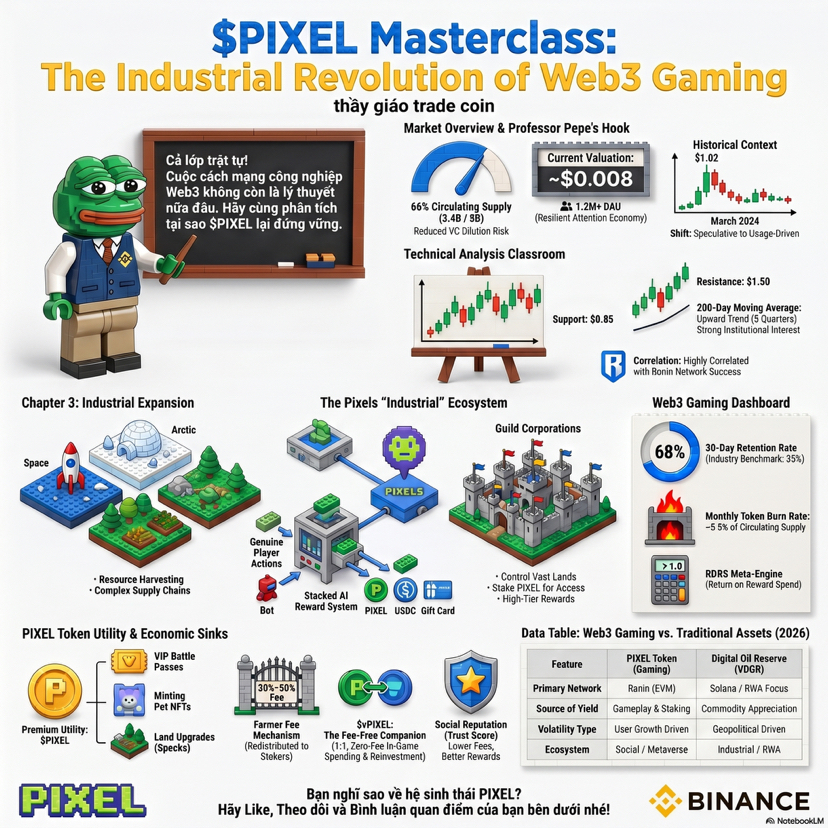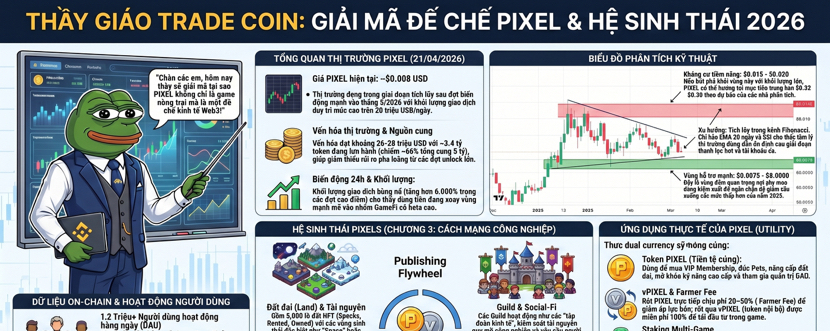 ) Đây là chỗ thú vị nhất về mặt thị trường, vì khi một dự án chuyển từ kiểu thưởng đơn giản sang kiểu buộc người dùng phải tương tác nhiều hơn với token, nó thường tạo ra hai thứ cùng lúc, một là nhu cầu thực dụng hơn, hai là áp lực kỳ vọng cao hơn. Mà thị trường crypto thì ai cũng biết rồi, kỳ vọng cao thì chart hay nhảy múa, nhưng nếu gameplay giữ được nhịp, token vẫn có cửa tạo ra đáy cao dần theo thời gian. Nhìn vào vùng giá hiện tại, thầy sẽ không gọi đây là tín hiệu bùng nổ, mà gọi nó là vùng kiểm tra niềm tin của thị trường. Giá đã cách đỉnh lịch sử rất xa, nhưng chính vì ở xa đỉnh nên nó không còn bị định giá bằng mơ mộng nữa, mà bị định giá bằng việc có còn ai thật sự dùng hay không. ([Binance][1]) Nói vui một chút thì PIXEL lúc này giống một học sinh không phải kiểu đứng nhất lớp ngay, nhưng vẫn ngồi đúng bàn, vẫn làm bài, vẫn có tương tác, và thầy sẽ quan sát nó bằng hai mắt, một mắt nhìn chart, một mắt nhìn hệ sinh thái. Nếu giá cứ giữ được nhịp giao dịch ổn, khối lượng không co lại quá mạnh, còn hệ sinh thái tiếp tục đẩy các cơ chế như staking, guild, pets, land và nhiệm vụ hằng ngày, thì câu chuyện của $PIXEL không còn là câu chuyện của một token game ngắn hạn, mà là câu chuyện về việc liệu một nền kinh tế trong game có thể được thị trường trả giá lại hay không.