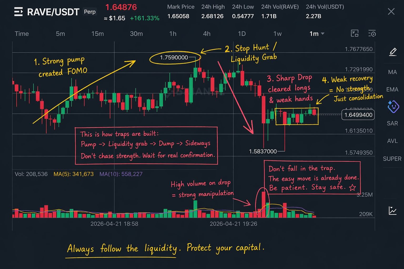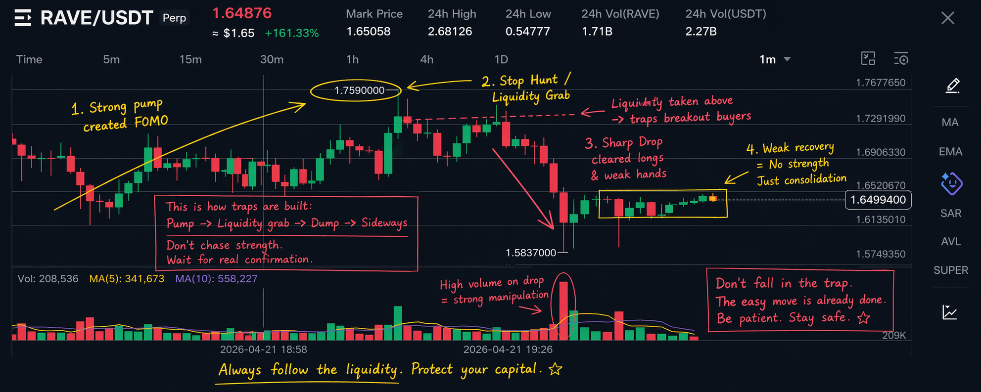 This is how traps form: Price runs up → attracts breakout traders → liquidity builds → sharp drop → slow, weak consolidation