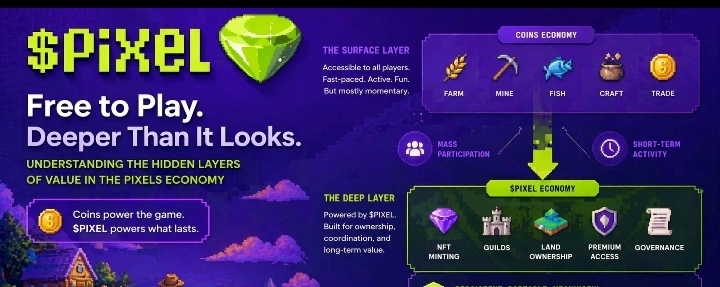 If Pixels keeps expanding, especially beyond a single game loop, this separation could start to matter more. Coins stay local. They serve the moment. $PIXEL, on the other hand, could start acting like a thread between different parts of the ecosystem. Not just as a currency, but as a way to carry certain outcomes forward.
