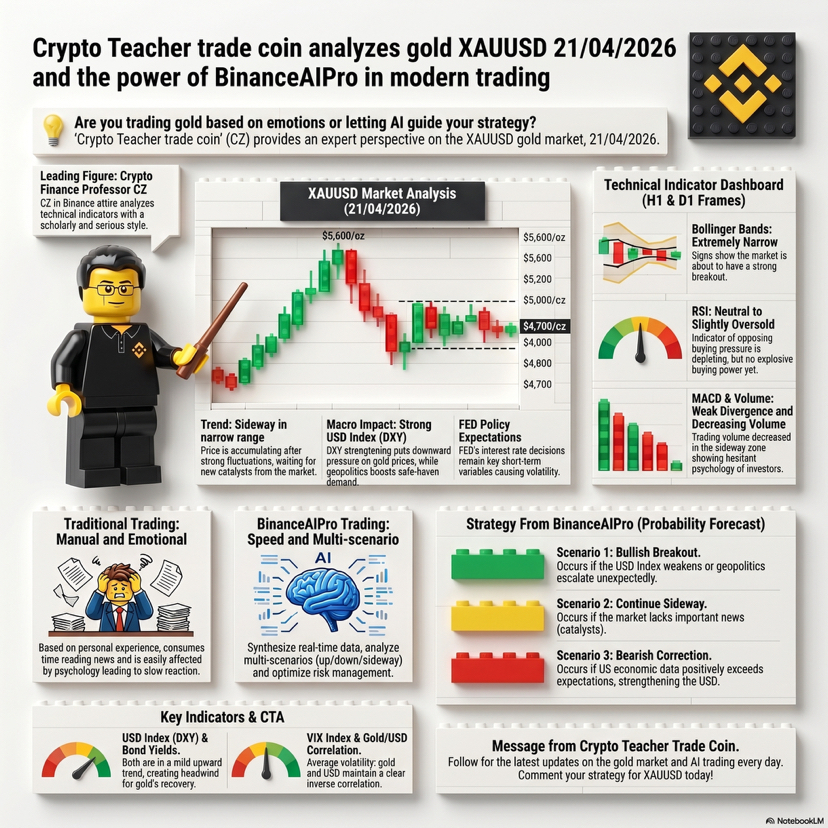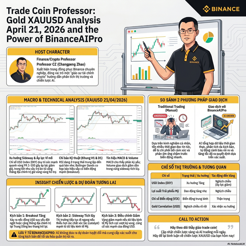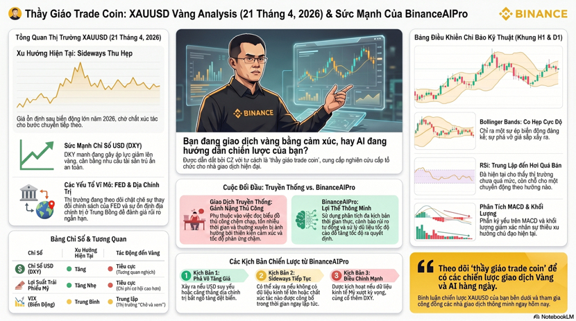 Anh em nào đang nhìn bảng giá vàng sáng nay mà thấy nó rung như cái quạt vào mùa nóng thì ngồi xuống đây với tôi một chút vì tôi là thầy giáo trade coin và hôm nay mình nói chuyện XAU theo kiểu của người sống bằng chart chứ không sống bằng cảm xúc. Theo Reuters sáng 21 4 2026 spot gold giảm 0.9 phần trăm xuống 4777.77 đô la mỗi ounce và hợp đồng futures tháng 6 giảm 0.7 phần trăm còn 4797.90 đô la do đồng USD mạnh lên trong lúc thị trường chờ thêm tín hiệu từ các cuộc đàm phán Mỹ Iran và phiên điều trần của người được đề cử vào ghế Fed Kevin Warsh. Reuters cũng cho biết vàng đang bị nén trong vùng giao dịch gần 4750 đến 4850 nên hôm nay nhìn chart vàng giống kiểu con sóng to nhưng bị chặn ở giữa đường chứ chưa có cú bứt hẳn sang một bên. Với tôi đây là thời điểm mà trader truyền thống hay bị mắc bẫy nhất vì họ nhìn một cây nến đỏ là vội hoảng nhìn một cây nến xanh là vội mơ tới mặt trăng còn thực tế vàng lúc này đang phản ứng rất mạnh với đồng bạc xanh lợi suất và tâm lý trú ẩn hơn là chỉ với một cây nến đơn lẻ. Nếu nhìn theo cách trade cổ điển thì tôi vẫn giữ ba lớp rất rõ một là xu hướng lớn trên khung ngày hai là vùng cung cầu gần nhất ba là tin tức có thể kích hoạt phá vỡ vùng biên. Truyền thống có cái hay là nó rèn kỷ luật giúp tôi không nhảy vào lệnh vì hứng nhưng cái dở là nó ngốn thời gian kinh khủng. Có những buổi sáng tôi mở cùng lúc chart tin tức lịch kinh tế và note cá nhân rồi đến lúc viết xong thì thị trường đã đi được một đoạn khá xa. Đó là lúc Binance AI Pro trở nên thú vị. Theo Binance AI Pro được mô tả là một tác nhân giao dịch AI có thể hỗ trợ phân tích thị trường theo thời gian thực theo dõi danh mục cảnh báo rủi ro và hỗ trợ chiến lược giao dịch với các mô hình AI như ChatGPT Claude Qwen và cơ chế kích hoạt bằng khóa API tách biệt có quyền hạn hạn chế. Nói ngắn gọn hơn là nó không cầm tay lái thay tôi nhưng nó giúp tôi rút ngắn đoạn từ dữ liệu đến quyết định. Và đây là chỗ tôi thích nhất vì rất nhiều người hiểu lầm AI là cỗ máy phán kèo trong khi bản chất của Binance AI Pro giống một trợ lý kỷ luật hơn. Khi trade vàng tôi thường dùng AI theo ba bước rất thực tế. Bước một tôi ném cho nó bối cảnh của ngày hôm nay gồm giá đang ở đâu vùng nào đang bị chặn và tin gì đang chi phối để nó gom lại thành một khung nhìn ngắn gọn. Bước hai tôi nhờ nó tách ra ba kịch bản cho riêng mình một kịch bản giá giữ trên vùng hỗ trợ một kịch bản giá bị từ chối ở vùng kháng cự và một kịch bản tin vĩ mô khiến volatility phình to. Bước ba tôi dùng nó như cái gương soi xem luận điểm của tôi có bị cảm xúc hóa quá mức hay không. Nói thật là nhiều lúc tôi gõ một nhận định nghe rất ngầu xong AI trả về một câu hỏi rất vô duyên kiểu bạn có dữ liệu nào chứng minh không và thế là tôi phải quay lại kiểm tra chart cho tử tế. Cái hay của công nghệ không nằm ở việc nó làm bạn đúng ngay lập tức mà ở chỗ nó bắt bạn bớt ảo. Binance cũng lưu ý rõ rằng AI không phải lời khuyên giao dịch và kết quả phụ thuộc vào cách bạn dùng nó nên đây không phải con đường để đổ lỗi khi lệnh sai mà là công cụ để giảm sai lầm có thể tránh được. Cá nhân tôi thấy giao dịch truyền thống giống lái xe đường dài bằng mắt và kinh nghiệm còn dùng AI giống có thêm bản đồ số và trợ lý đọc biển báo. Người lái giỏi vẫn là bạn nhưng quãng đường bớt mù hơn. Với XAU hôm nay tôi không thích đuổi giá ở giữa vùng vì đó là nơi dễ ăn cú quét hai đầu nhất. Tôi thích chờ thị trường xác nhận rõ hơn xem nó muốn giữ phía trên hay bị kéo lại vào vùng cân bằng. Nếu đồng USD tiếp tục khỏe và thị trường còn căng vì tin địa chính trị thì vàng vẫn có thể lắc mạnh trước khi chọn hướng. Nhưng nếu lực bán yếu đi và dòng tiền trú ẩn quay lại thì vùng đang bị kìm nén hôm nay rất dễ biến thành bàn đạp cho nhịp mới. Cái tôi rút ra sau nhiều năm trade là đừng thần thánh hóa một công cụ nào cả kể cả AI. AI tốt nhất khi nó giúp bạn viết nhanh hơn nhìn rõ hơn và kỷ luật hơn còn quyết định cuối cùng vẫn phải là của chính bạn. Nếu anh em đang trade vàng thì đừng hỏi mỗi câu mua hay bán hãy hỏi trước là thị trường đang kể câu chuyện gì và tôi có đủ lý do để tham gia hay chưa. Nếu thấy bài này hữu ích thì thả like follow cho tôi và comment vùng giá anh em đang canh tôi sẽ viết tiếp phần hai theo kiểu bóc chart vàng rất sát thực tế cho anh em. @Binance Vietnam