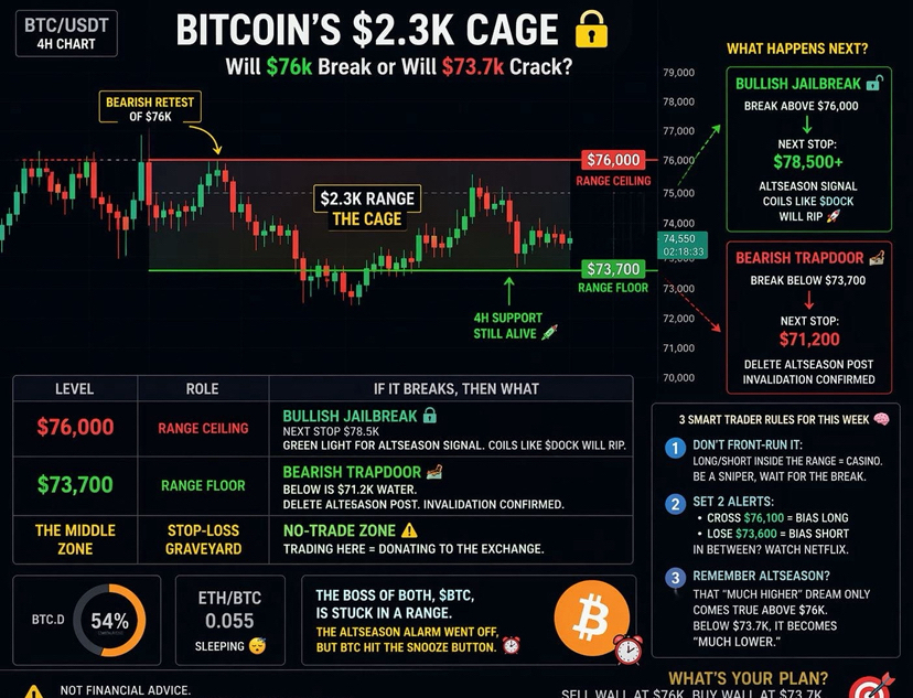 “БІТКОІН ЗАСТРЯГ 🚨 | $76K СТІНА проти $73.7K ПІДЛОГА — ОДНЕ РУЙНУВАННЯ = 10% ВИБУХ”