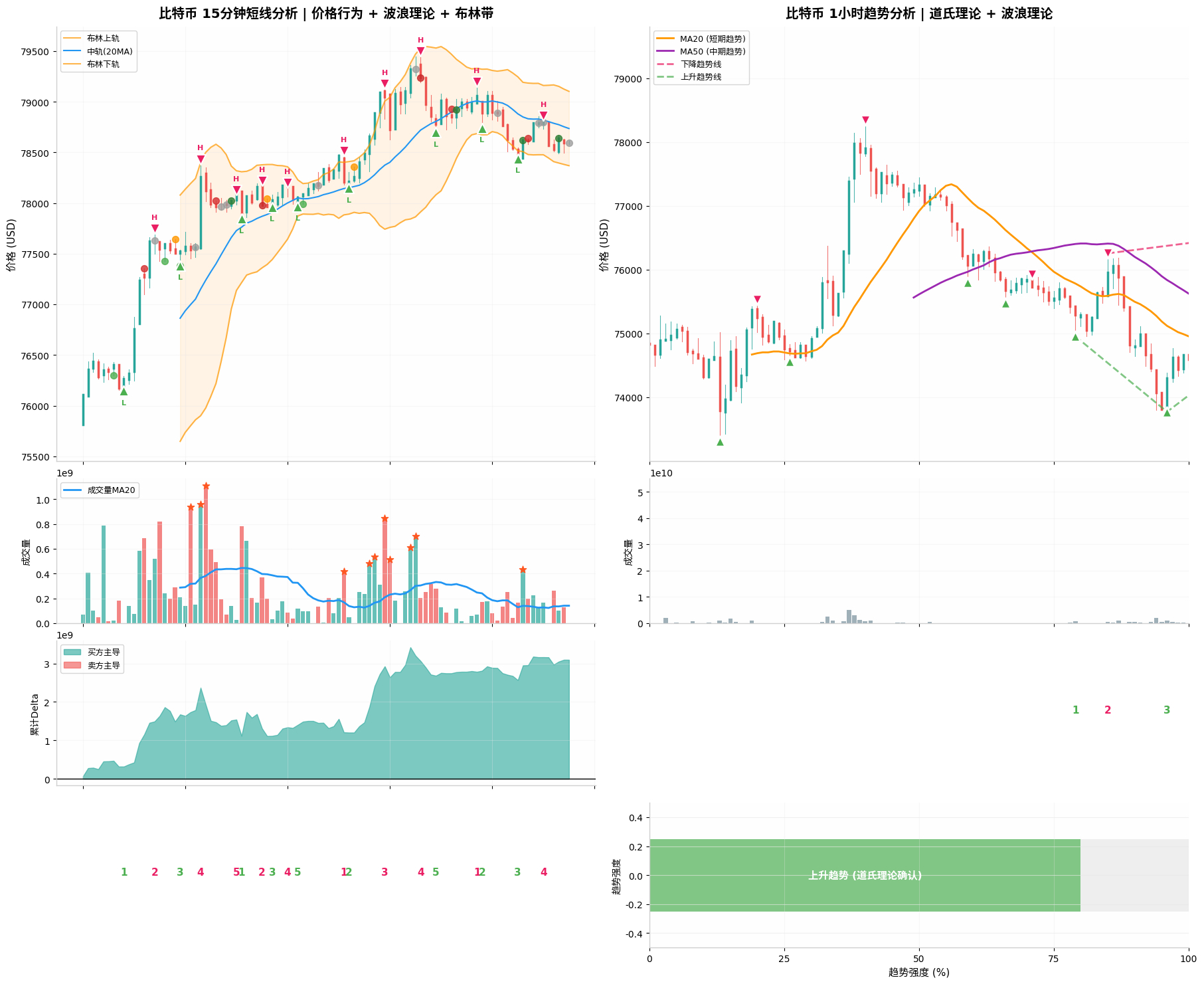 · 主要趋势(Primary Trend): 向上。均线多头排列确认中期上升趋势健康运行。价格从昨日低点 75,804 反弹至当前78,593,涨幅约 3.7%,多头力量非常强劲。