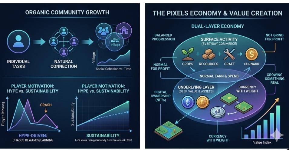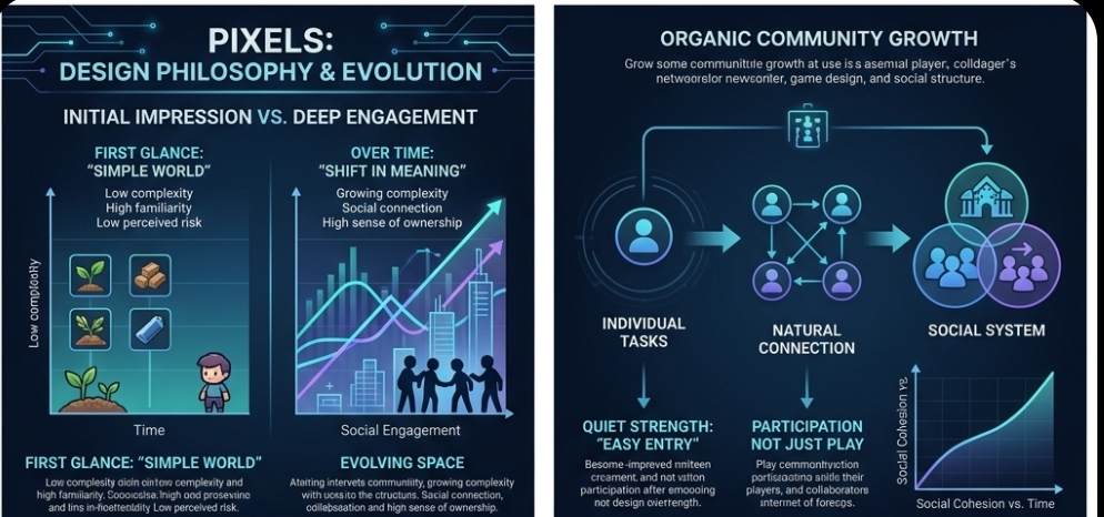 Nó được tạo ra trong thời điểm mà nhiều trò chơi dựa trên blockchain đang mất đi niềm tin. Những hệ thống trước đó tập trung rất nhiều vào việc kiếm tiền nhưng quên xây dựng một cái gì đó mà mọi người thực sự thích. Khi phần thưởng phai nhạt, người chơi rời đi. Pixels đã chọn một con đường khác. Nó không cố gắng hứa hẹn thu nhập. Nó cố gắng xây dựng một nơi mà mọi người sẽ muốn quay lại.