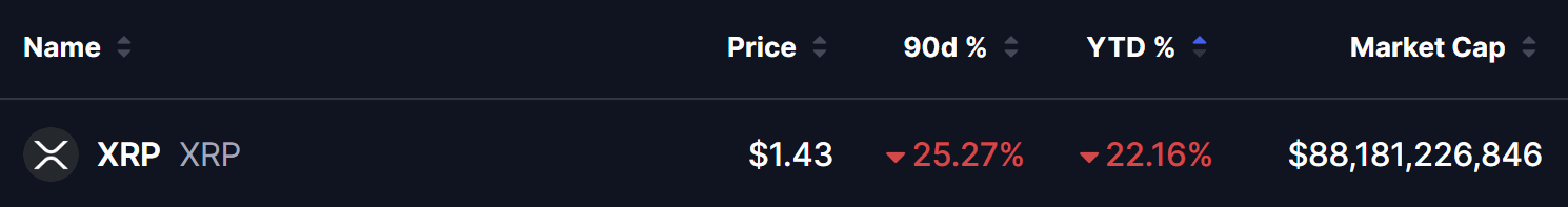 $XRP hiện đang giao dịch quanh mức $1.43, mang lại vốn hóa thị trường khoảng $88.18 tỷ. Mặc dù đã giảm 25.27% trong 90 ngày qua và 22.16% kể từ đầu năm, một sự kết hợp giữa tín hiệu kỹ thuật và tiến triển quy định đang bắt đầu thay đổi tâm lý quay trở lại ủng hộ bò.