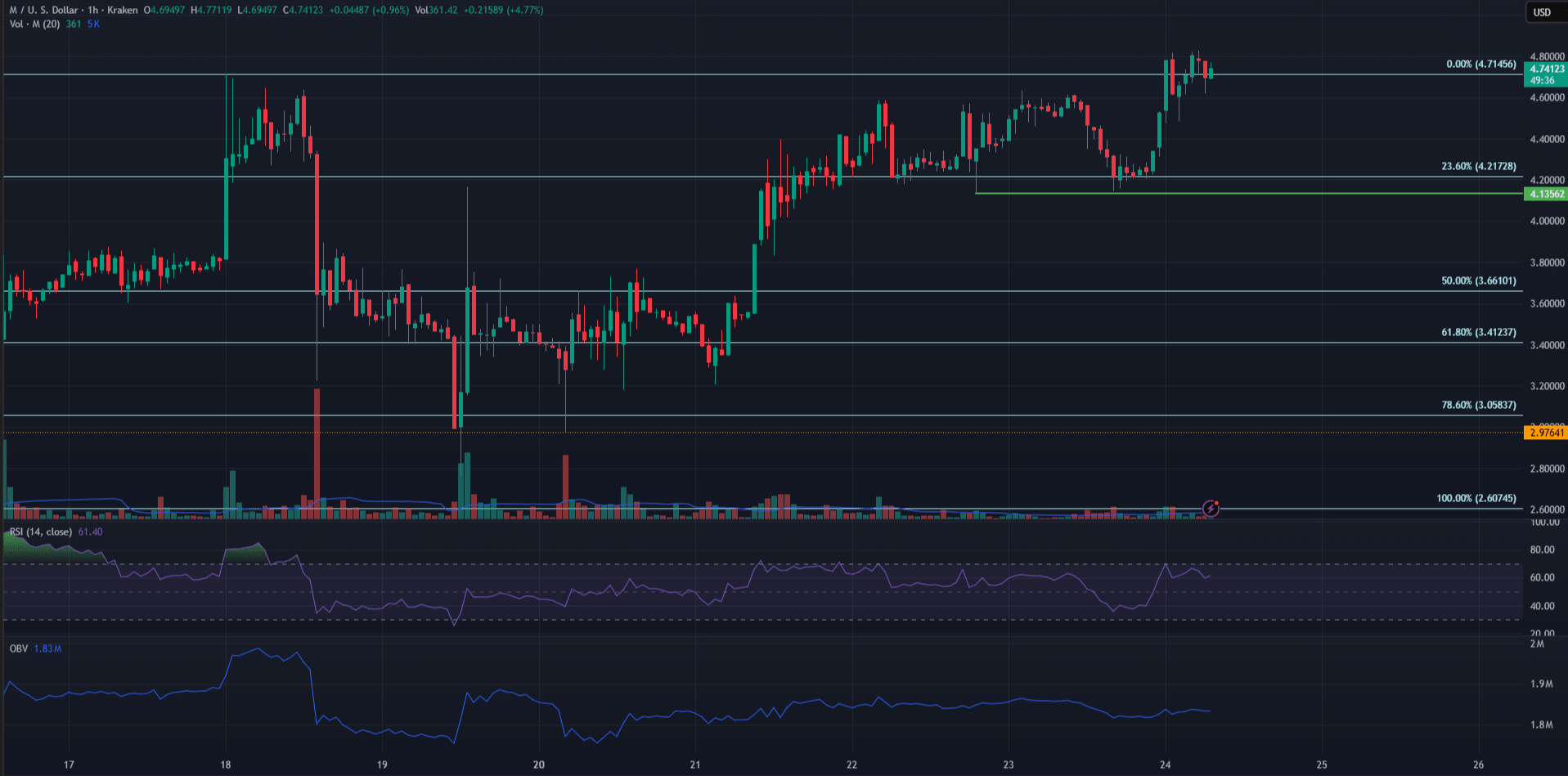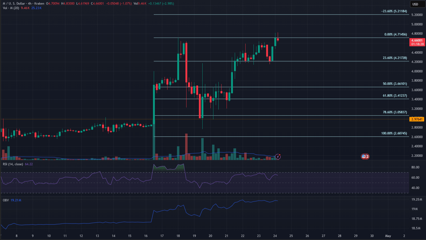 $M tiếp tục đà tăng giá mạnh mẽ, khẳng định vị thế là một trong những tài sản hoạt động tốt nhất trong top 20 tiền điện tử với mức tăng 22% hàng tuần, kiểm tra lại thành công mức hỗ trợ 3 USD và tăng lên 4,7 USD.