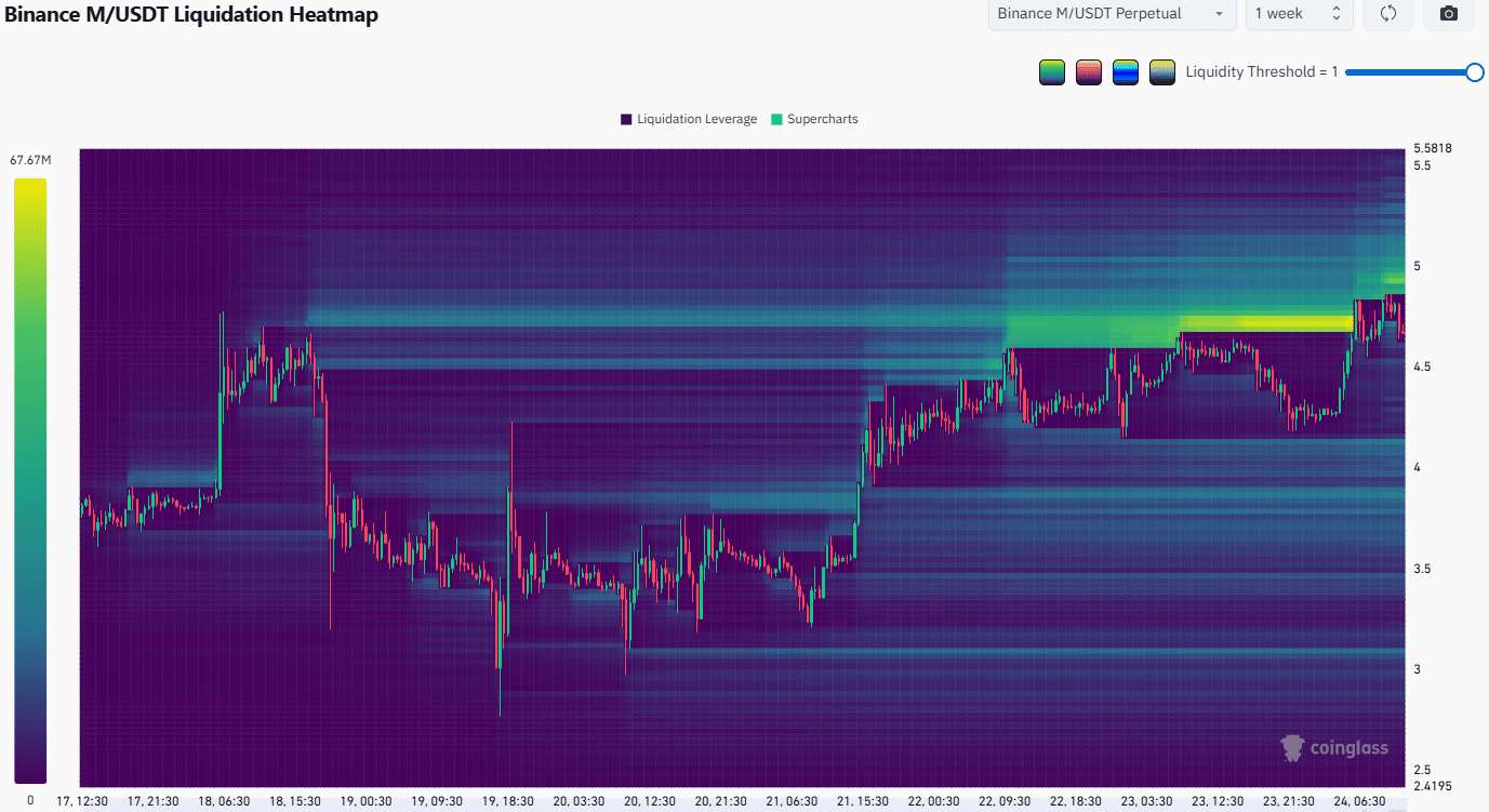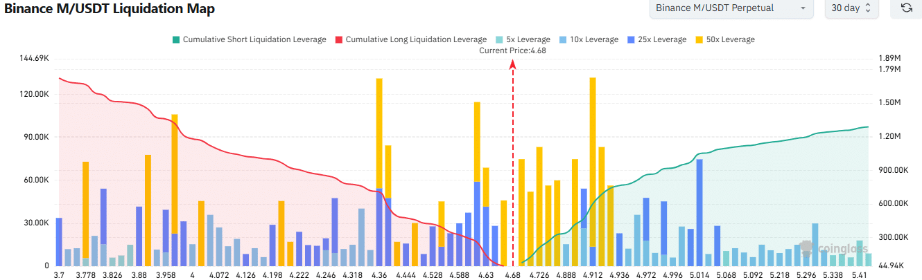 🔸 Bản đồ thanh lý tiết lộ các cụm thanh lý lệnh bán khống (short) dày đặc từ 4,72 USD đến 4,93 USD với đòn bẩy tích lũy cao, làm cho một đợt đẩy giá lên vùng nam châm tâm lý 5 USD có xác suất rất cao. Ngược lại, các cụm thanh lý lệnh mua (long) phía dưới không được xây dựng đáng kể trong tuần qua.