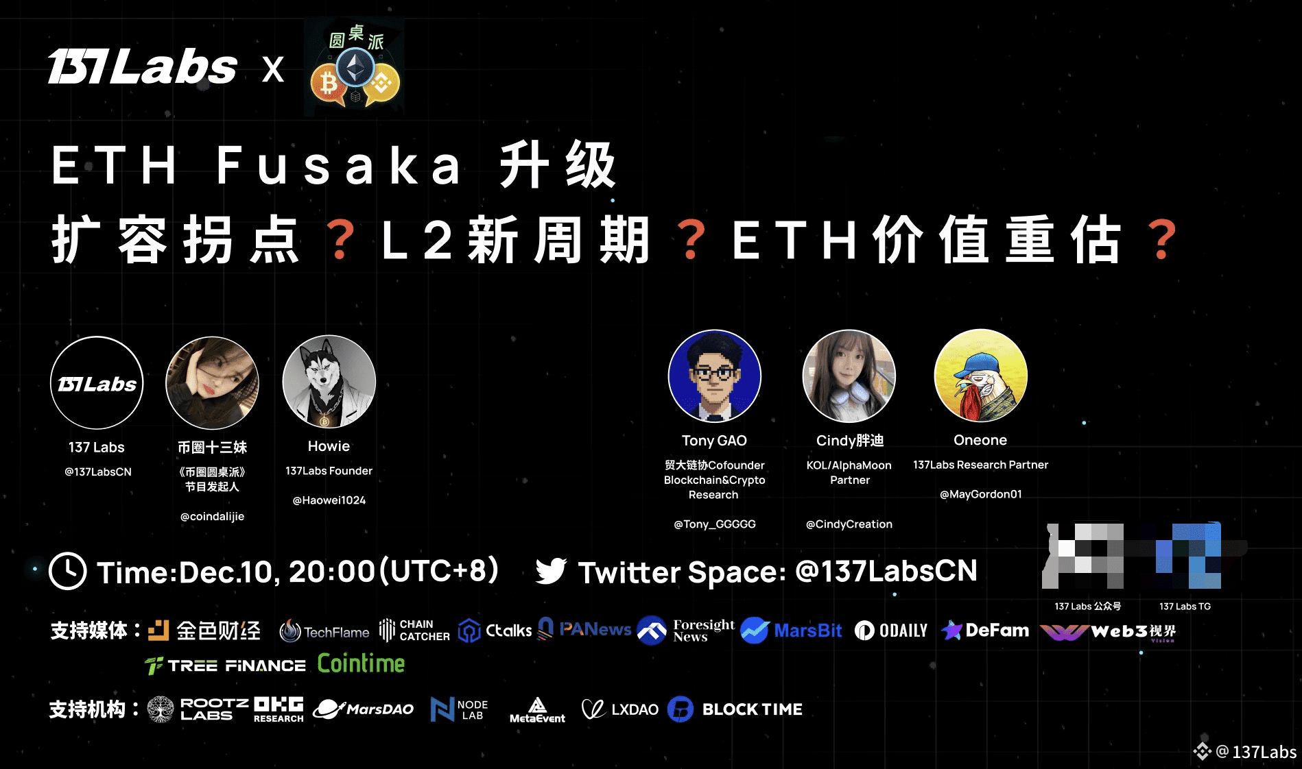 Ngày 10 tháng 12 năm 2025, 137Labs phối hợp với Hội nghị bàn tròn tiền điện tử tổ chức sự kiện X Space với chủ đề 【Nâng cấp ETH Fusaka: Điểm bùng phát mở rộng? Chu kỳ mới L2? Đánh giá lại giá trị ETH?】. Sự kiện này đã mời (Hội nghị bàn tròn tiền điện tử) người sáng lập Thập Tam Muội, người sáng lập 137 Labs Howie, nhà nghiên cứu Oneone, KOL Cindy và nhà nghiên cứu Tony của Đại học Thương mại, cùng nhau thảo luận sâu về lõi công nghệ của lần nâng cấp này, ảnh hưởng đến các vai trò trong hệ sinh thái và triển vọng tương lai của ngành.