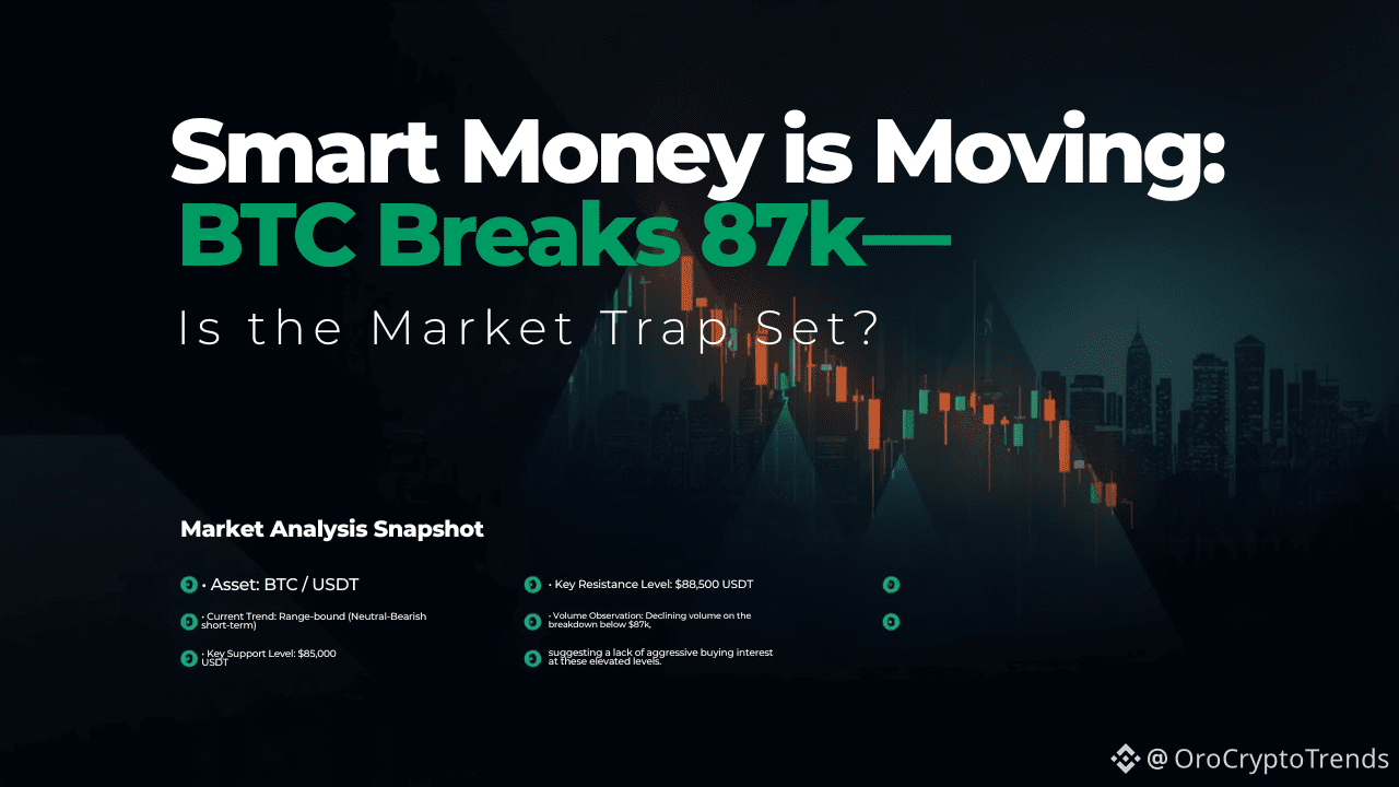 Thị trường crypto hiện đang đứng ở một ngã tư bốn hướng. Vài giờ trước, Bitcoin đã giảm xuống dưới mức tâm lý 87.000 USDT. Trong khi biểu đồ 24 giờ vẫn phản ánh một mức tăng nhẹ 0,60%, động lực thu hẹp cho thấy rằng Tiền Thông Minh đang định vị.