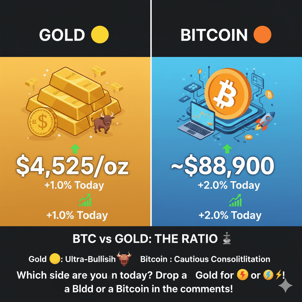 Trong khi đó, Bitcoin ($BTC BTC) đang điều hướng một con đường đầy biến động hơn. Mặc dù nó vẫn là vua không thể tranh cãi của tài sản kỹ thuật số với vốn hóa thị trường là 1,78 triệu triệu đô la, nhưng gần đây nó đã phải đối mặt với một khoảng lặng trong mùa lễ, giao dịch quanh mức 88.000–89.000 đô la 📉💻. Khác với sự leo lên liên tục của Vàng, BTC hiện đang giảm khoảng 6-7% từ đầu năm đến nay, vật lộn để duy trì câu chuyện "vàng kỹ thuật số" của mình khi dòng chảy ETF từ các tổ chức và thanh khoản mỏng trong mùa lễ tác động đến giá của nó. Tuy nhiên, với tỷ lệ Bitcoin so với Vàng khoảng 19,6, nhiều người đam mê xem đó là một vùng tích lũy lớn trước khi bước tiếp theo có thể xảy ra.