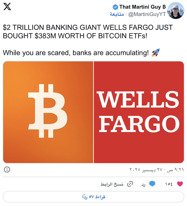 Wells Fargo quản lý hàng nghìn tỷ đô la tài sản trên toàn cầu. Các quyết định vốn của họ ảnh hưởng đến tâm lý thị trường lớn hơn cả quy mô của khoản đầu tư. Khi một tổ chức lớn tăng mức độ tiếp xúc với tiền điện tử, Bitcoin được phân loại như một tài sản cấp tổ chức, điều này khuyến khích nhiều tổ chức hơn nữa áp dụng tiền điện tử trong các thị trường tài chính. Niềm tin lan tỏa qua hành động hơn là sự đầu cơ.