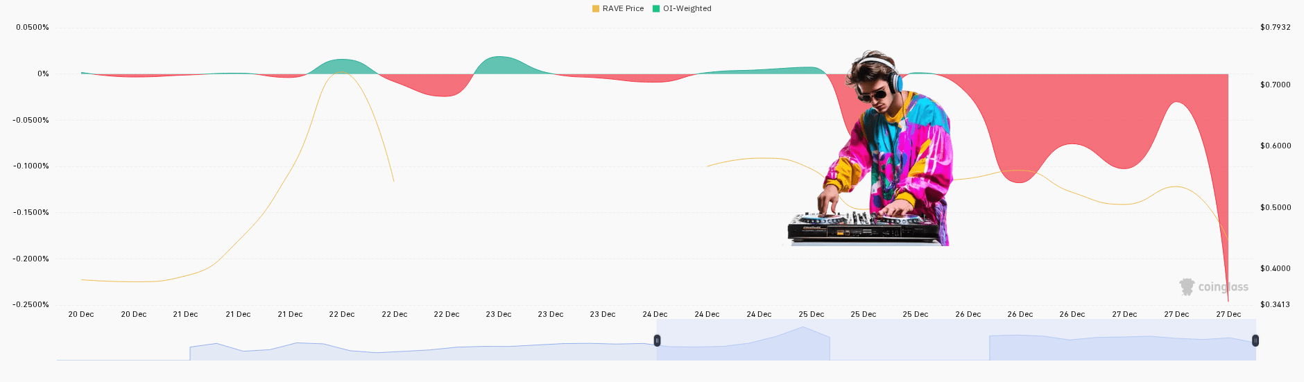 Chà, RAVE chắc chắn đã mang đến cho chúng ta một buổi biểu diễn vào tháng 12, phải không? Bắt đầu một chút uể oải quanh mức $0.40, đồng tiền này quyết định đã đến lúc bước lên sân khấu chính. Chúng tôi đã chứng kiến một sự tăng giá ngọt ngào, vượt qua $0.70 vào khoảng ngày 22, với các tín hiệu Lợi ích Mở phát sáng màu xanh như một ánh đèn chiếu sáng. Trong một khoảnh khắc, cảm giác như bữa tiệc sẽ không bao giờ kết thúc, giữ vững với động lực khá tốt. Nhưng như bất kỳ DJ giỏi nào cũng biết, cú rơi đang đến. Sau một nỗ lực ngắn ngủi để phục hồi, giữ quanh mức $0.60 giữa tuần, RAVE đã thực hiện một màn biến mất cổ điển vào ngày 27. Giá đã giảm mạnh, rơi tự do từ mức $0.60 thẳng xuống $0.34. Chỉ số OI-Weighted xác nhận sự ra đi ồ ạt, chuyển sang màu đỏ nhanh hơn cả một cái đỏ mặt trong buổi hẹn hò đầu tiên. Đó là một cú thoát tàn nhẫn cho bất kỳ ai đã kiên trì, một lời nhắc nhở đúng đắn rằng đôi khi động thái tốt nhất là rời khỏi trước khi hệ thống âm thanh nổ tung.