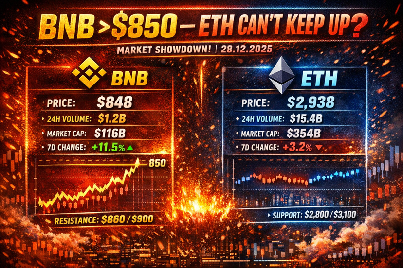 Vào ngày 28 tháng 12 năm 2025, BNB gần nhưng không quyết định trên $850 theo các nguồn dữ liệu lịch sử lớn (các bản in trong ngày và các nguồn dữ liệu sàn có thể cho thấy các đỉnh ngắn trên 850, nhưng một mức đóng cửa liên tục trên mức đó đã thiếu trong các ảnh chụp dữ liệu chính). ETH trong cùng ngày đó nằm quanh mức $2.9k–2.94k với vốn hóa thị trường ~3x BNB, vì vậy về cấu trúc, ETH vẫn là giao thức lớn hơn nhiều với các đặc điểm rủi ro/điểm trở lại khác nhau.