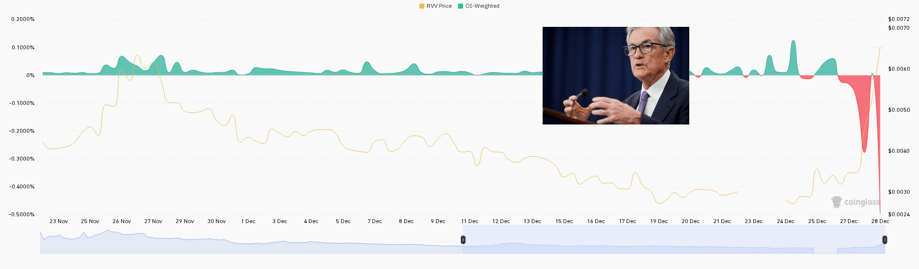Được rồi, các bạn, nếu các bạn không nhìn vào RVV, các bạn cần phải làm ngay bây giờ. Một kịch bản ác mộng tuyệt đối đã diễn ra vào ngày 28 tháng 12! Sau nhiều tuần chảy máu chậm chạp, đau đớn, ôm lấy đường -0.40%, RVV đã quyết định tung hết sức... thẳng vào vực thẳm. Thật sự, giá đã bay hơi từ gần $0.006 xuống còn $0.0024 trong nháy mắt! Đó là một cú giảm 60% tàn khốc, các bạn ạ. Biểu đồ OI-Weighted, vốn dĩ thường khá bình tĩnh, đã chuyển sang màu đỏ thẫm và lao xuống mạnh mẽ ngay trước khi sụt giảm, kêu gào các dấu hiệu cảnh báo thanh lý rõ ràng. Còn khối lượng giao dịch? Một cú nhảy khổng lồ vào ngày 28, xác nhận rằng đây không chỉ là một lỗi – đó là một sự capitulation hoàn toàn. Bất kỳ ai bị cuốn vào cuộc rơi tự do đó mà không có lệnh dừng lỗ đều đã trải nghiệm nỗi đau hoàn toàn, không bị pha trộn. Đây là một ví dụ điển hình về lý do tại sao bạn cần phải giữ tỉnh táo và quản lý rủi ro của mình; RVV vừa cho chúng ta thấy sự biến động cực đoan trông như thế nào khi nền tảng bị sụp đổ. Hãy theo dõi không gian này, nhưng ôi trời, thật là một động thái tàn bạo!