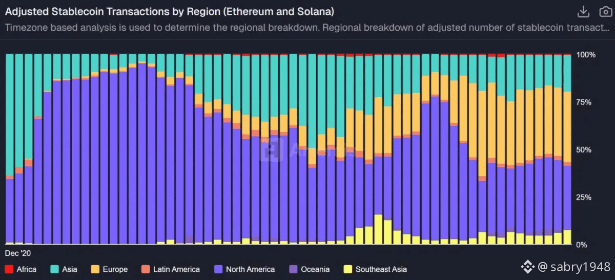 شهدت العملات المستقرة المبنية على شبكتي إيثريوم وسولانا نموًا كبيرًا في الاستخدام في أوروبا مقارنة بباقي المناطق العالمية. هذا الارتفاع حدث رغم العقبات الناتجة عن التدقيق التنظيمي المكثف والقوانين الصارمة على العملات الرقمية، مما يشير إلى تبنٍ واسع وطلب حقيقي متزايد.