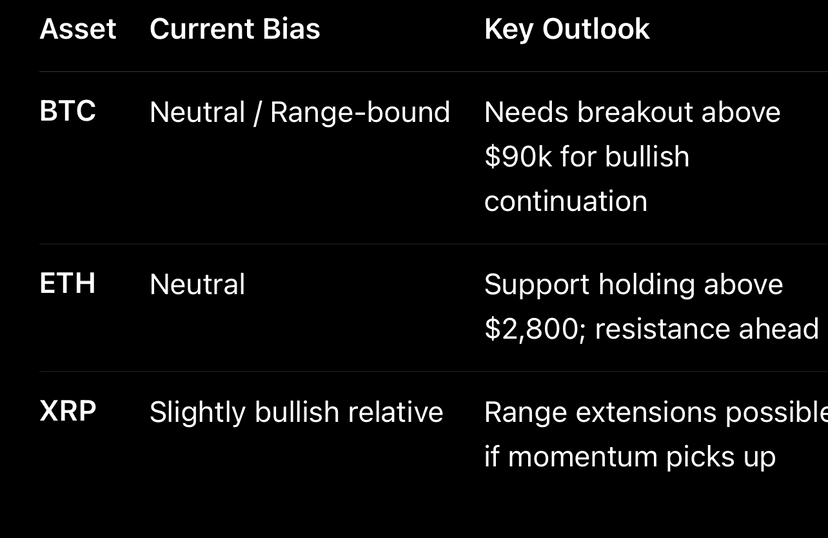 • Bảng tóm tắt hiệu suất: XRP tiếp tục cho thấy sức mạnh tương đối so với thị trường rộng lớn hơn, giao dịch gần $1.85–$1.90 — vượt trội hơn BTC và ETH về tỷ lệ phần trăm với khối lượng thấp.