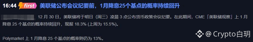 我刚看到一条快讯,根据CME“美联储观察”工具的数据,市场认为明年1月就降息的概率,已经从上周的15.5%升到了18.3%。虽然绝对值不高,但在公布纪要前回升,这个动向很有意思。