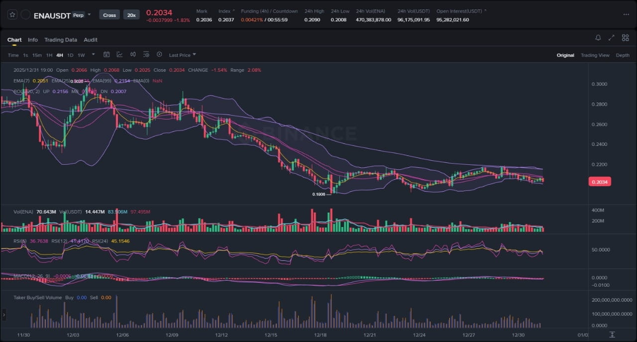 ENAUSDT hiện đang bị khóa trong một giai đoạn hợp nhất sau một xu hướng giảm rõ rệt đã thiết lập một mức thấp địa phương xung quanh mức 0.1908 vào giữa tháng 12. Kể từ đó, thị trường không thể tạo ra một xu hướng đáng kể, mà thay vào đó dao động trong một khoảng rõ ràng. Hành động giá này gợi ý một trạng thái cân bằng nơi mà cả bò và gấu đều không thể xác lập kiểm soát, dẫn đến việc thu hẹp các dải giá và thiếu sự thuyết phục theo hướng chung.