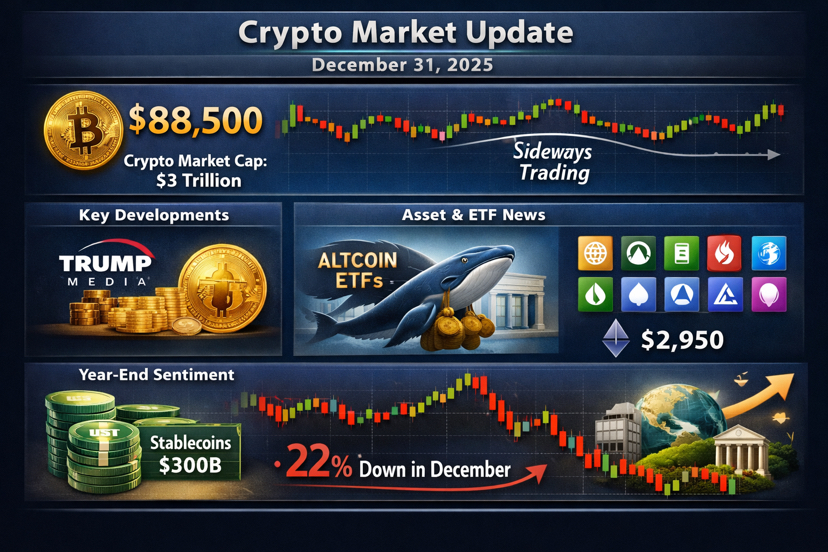 • Bitcoin & Vốn hóa Thị trường: Bitcoin dao động quanh mức ~$88K–$89K khi năm 2025 khép lại, cho thấy động lực yếu nhưng có mức tăng hàng ngày khiêm tốn. Tổng vốn hóa thị trường tiền điện tử ~$3T với hiệu suất pha trộn giữa các đồng tiền chính.