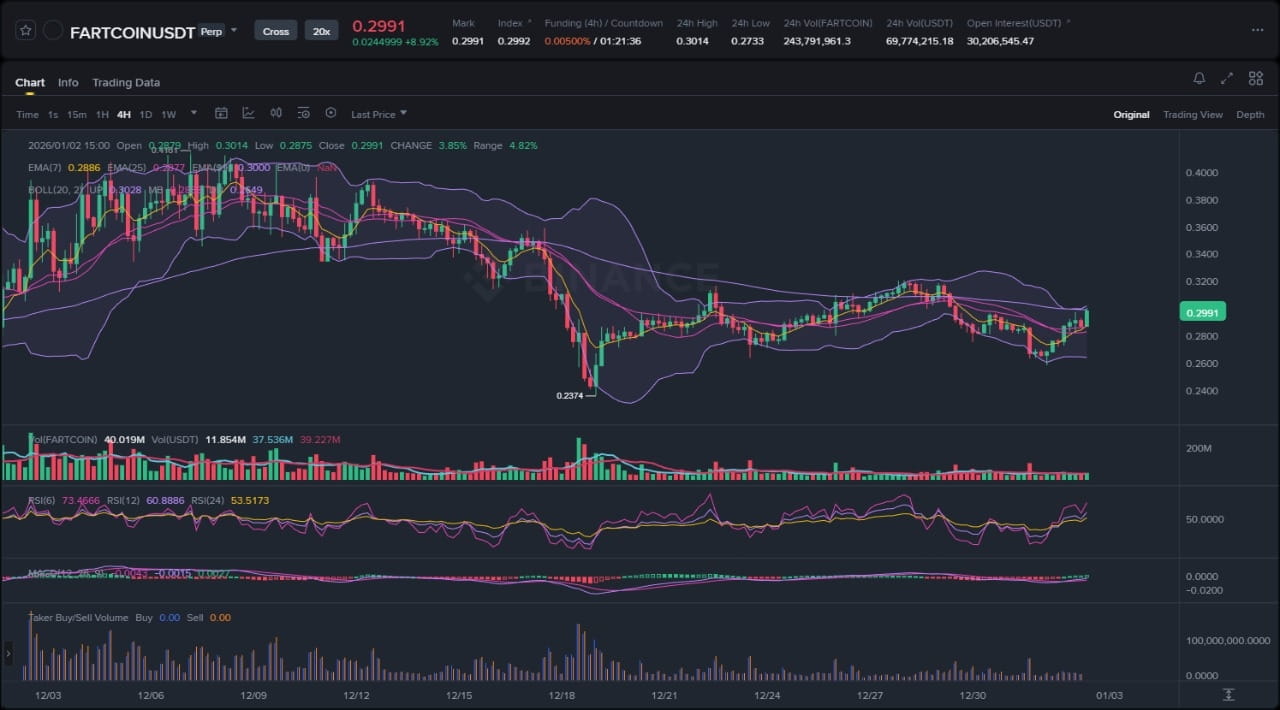 Hành động giá của FARTCOIN đã bước vào một khúc ngoặt kỹ thuật quan trọng, được đặc trưng bởi sự phục hồi mạnh mẽ từ mức thấp giữa tháng 12 và một cuộc đối đầu mới với các mức kháng cự phía trên. Sau một giai đoạn biến động mạnh, nơi tài sản đã mất đi một phần đáng kể vốn hóa thị trường của nó, cấu trúc hiện tại trên biểu đồ vĩnh viễn 4 giờ cho thấy một sự thay đổi trong tính cách của thị trường. Tài sản hiện đang giao dịch quanh mức 0.2991, ghi nhận mức tăng đáng chú ý trong ngày gần 9%. Di chuyển này không chỉ đơn thuần là một sự bật kỹ thuật mà có vẻ như được hỗ trợ bởi dòng chảy trên chuỗi mạnh mẽ và sự thay đổi cảm xúc trong số những người nắm giữ khối lượng lớn. Sự hội tụ của một thiết lập kỹ thuật tăng giá với sự tích lũy cá voi thu hút sự chú ý vẽ nên một bức tranh phức tạp cho các nhà giao dịch, cân bằng giữa khả năng đảo chiều xu hướng và những rủi ro của sự kiệt sức vào cuối chu kỳ trong lĩnh vực tài sản meme rộng lớn hơn.