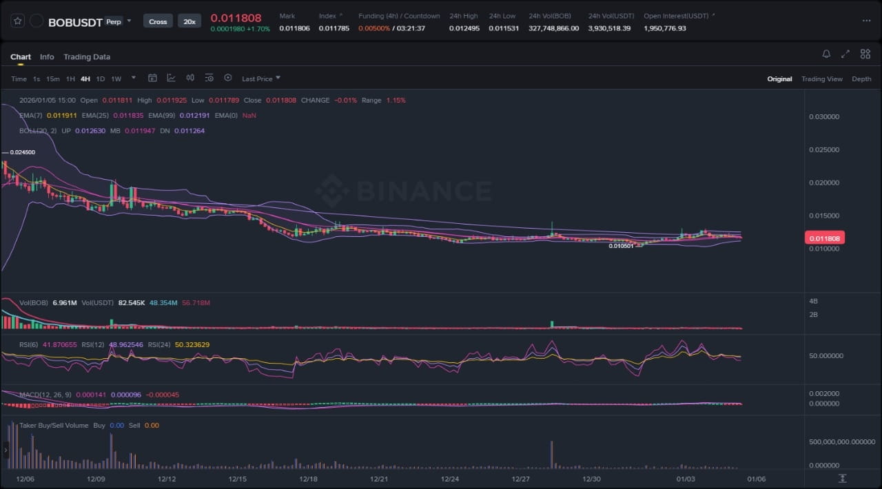 Cặp BOB/USDT trên Binance thể hiện một động thái tăng giá mạnh mẽ rõ ràng bắt nguồn từ mức thấp giữa tháng 11 khoảng vùng 0.0005-0.0006, đẩy token đến một đỉnh swing gần đây gần 0.0020. Đợt tăng này đồng bộ về mặt thời gian với thông báo niêm yết Bithumb của Hàn Quốc vào ngày 3 tháng 12 năm 2025, đánh dấu một cú rửa túi thanh khoản theo sách giáo khoa tiếp theo là sự mở rộng của biến động. Sau đỉnh, cấu trúc đã chuyển sang một phạm vi hợp nhất chặt chẽ, với hành động giá tôn trọng ranh giới trên gần mức cao gần đây trong khi hình thành các đỉnh thấp hơn trong RSI, gợi ý về các rủi ro hồi quy trung bình. Hồ sơ khối lượng cho thấy sự tham gia tăng cao trong quá trình bứt phá nhưng giảm dần trong phạm vi hiện tại, gợi ý việc chốt lời của những người đi trước. Bối cảnh thị trường tổng thể vẫn hỗ trợ, với sự ổn định của Bitcoin cung cấp động lực cho các câu chuyện layer-2, mặc dù sự xoay vòng altcoin có thể tạo ra áp lực hồi quy trung bình.