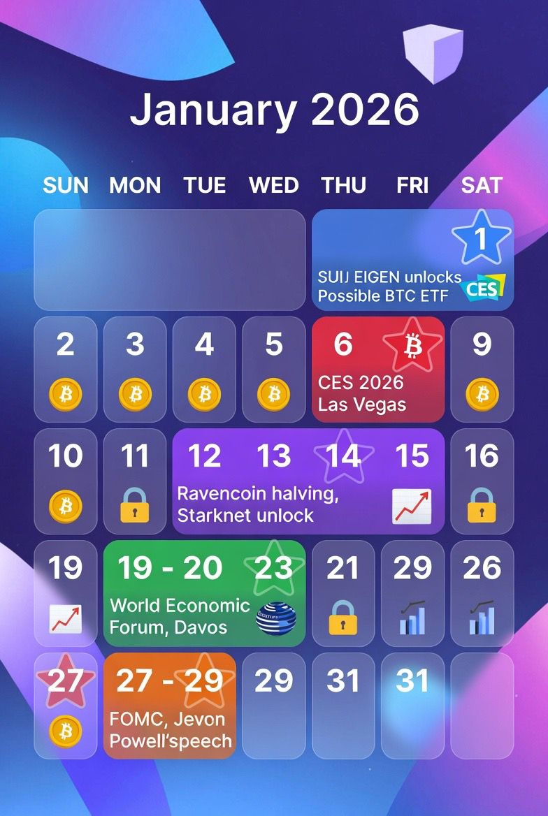 Tháng 1 tích lũy hàng trăm triệu từ các đợt mở khóa (sốc cung tiềm năng → giảm ngắn hạn), nhưng được cân bằng bởi các nâng cấp (khả năng mở rộng), halving (hiếm có) và yếu tố vĩ mô thuận lợi nếu Fed có thái độ nhu hòa. Các chủ đề chính: sự thâm nhập tổ chức (ETFs, quy định), RWA và công nghệ (CES/Davos). Dự kiến biến động cao – DYOR, quản lý rủi ro và theo dõi các 'whales'.