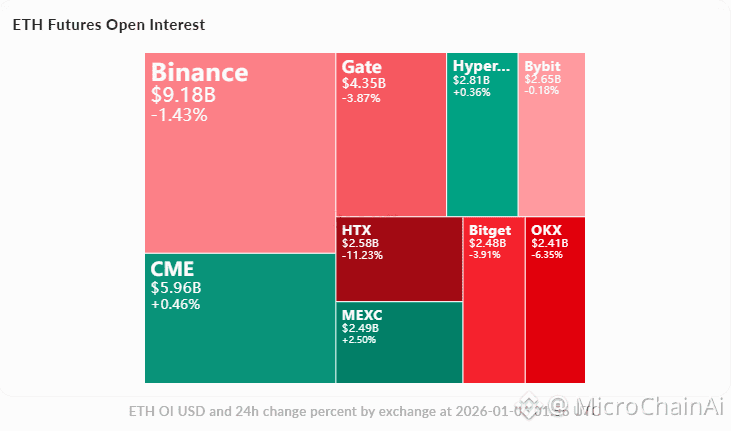持仓量:总持仓$416亿,24小时小幅下降1%,Binance占$92亿(-1.4%),Bybit占$26亿(-0.2%),显示轻微去杠杆。