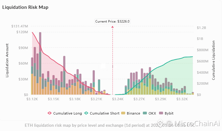 清算数据:过去24小时总清算$7700万,其中空头清算$5900万,多头清算$1900万,短期空头挤压明显。$3,122下方累计$11亿多头清算风险,$3,336上方$6.79亿空头清算压力,构成潜在连锁反应区间。