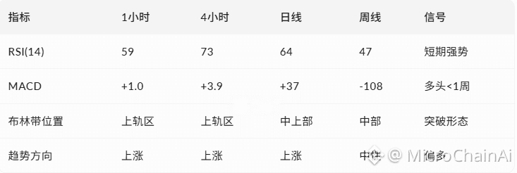 1小时级别:价格位于$3,257布林带上轨附近,站稳50日均线($3,168)和200日均线($3,049)上方,呈现突破后的多头整理形态。RSI为59,处于中性区间,显示短期动能健康。