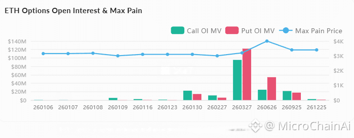 期权市场:总持仓量$76亿(+3.4%),最大痛点集中在$3,100-$3,200区间,临近到期时可能产生价格锚定效应。