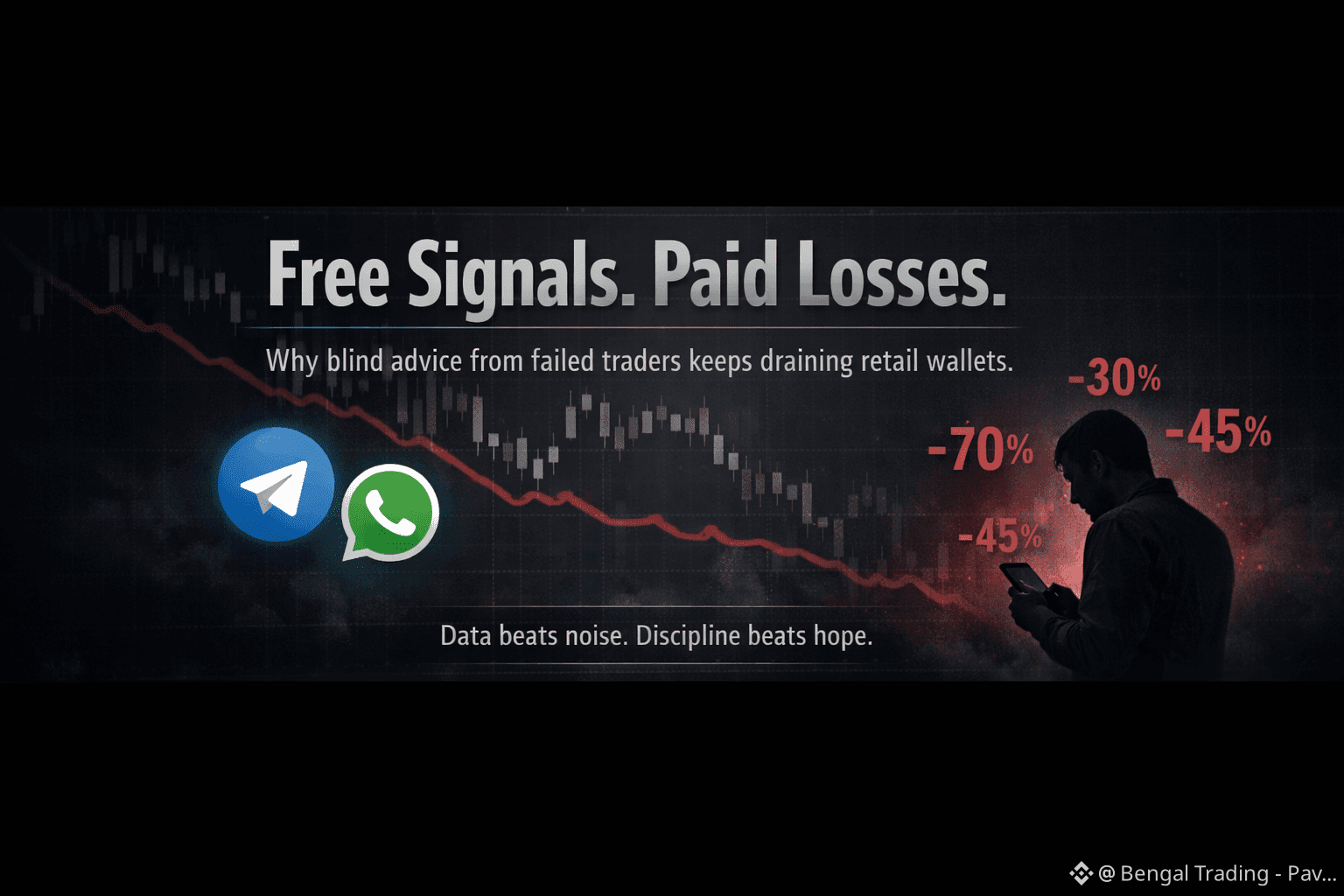 The numbers are sobering. Multiple market surveys show that around 70–80 percent of retail traders lose money in their first year. A separate analysis of public signal channels found that more than 85 percent of “free signals” fail to beat a simple buy-and-hold strategy after fees and slippage. Yet, these failed trades are rarely highlighted. Losses are reframed as “temporary pullbacks,” and charts are cherry-picked to create false hope.