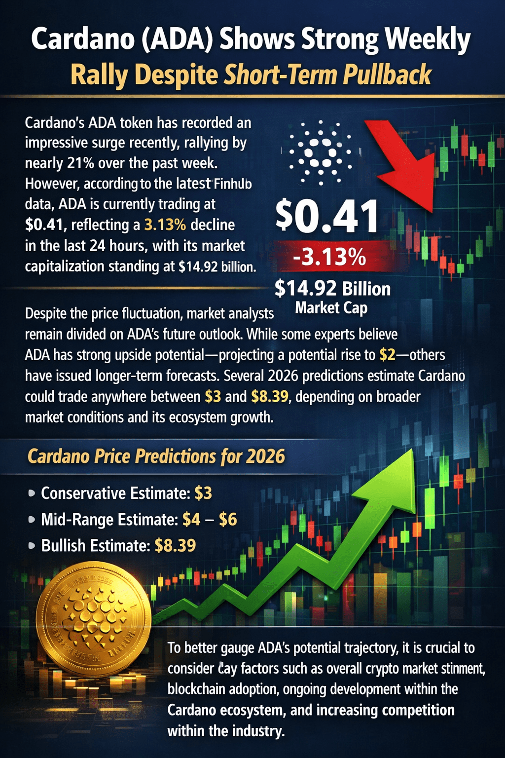 Token $ADA của Cardano đã ghi nhận đà tăng ấn tượng gần đây, tăng gần 21% trong tuần qua. Tuy nhiên, theo dữ liệu mới nhất từ Finnhub, ADA hiện đang giao dịch ở mức **$0.41**, phản ánh mức giảm **3.13% trong 24 giờ qua**, với vốn hóa thị trường đạt mức **$14.92 tỷ**.