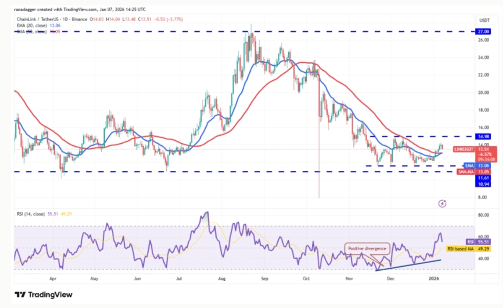 LINK tiếp tục giao dịch trong một khoảng giữa $11.61 và $14.98. Một cú hồi phục từ các đường trung bình động có thể kích hoạt một sự bứt phá trên kháng cự, nhắm đến $16.80 và $17.66.