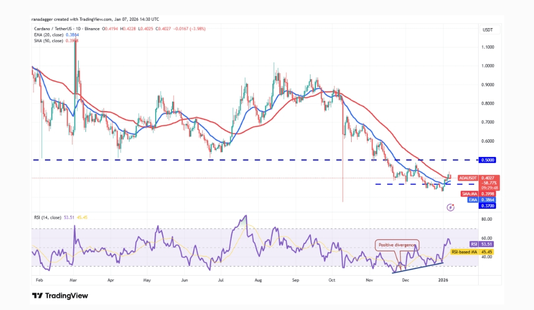 Một cú hồi phục có thể đẩy ADA/USDT về phía $0.50, trong khi một sự phá vỡ dưới $0.37 sẽ tăng rủi ro giảm xuống $0.33 và có thể là $0.27.