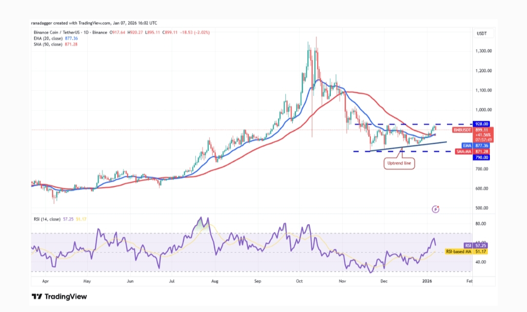 BNB gặp kháng cự gần $928, nhưng EMA 20 ngày tăng tại $877 và RSI tích cực cho thấy bò vẫn giữ quyền kiểm soát. Một mức đóng cửa hàng ngày trên $928 sẽ hoàn tất một tam giác tăng, với mục tiêu dự kiến gần $1,066.
