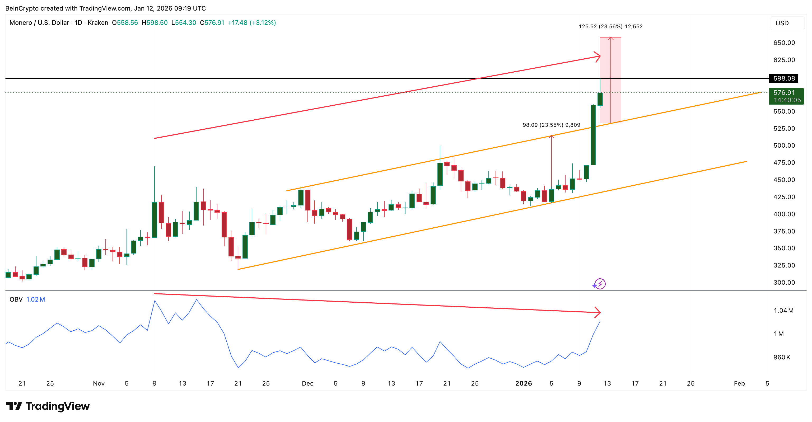 OBV cho thấy sự phân kỳ giảm giá, cho thấy hỗ trợ từ khối lượng yếu hơn và vẫn cần xác nhận thêm.