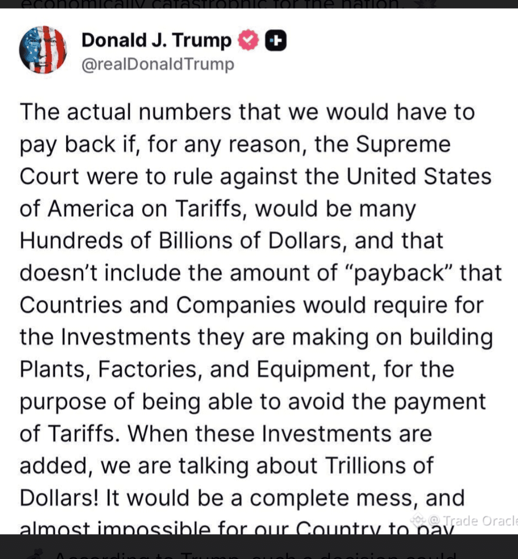 🇺🇸 Mỹ có thể đang tiến gần đến một cơn bão tài chính nghiêm trọng. Cựu Tổng thống Donald Trump đã đưa ra lời cảnh báo nghiêm khắc: nếu Tòa án Tối cao Hoa Kỳ bác bỏ các cấu trúc thuế quan hiện tại, hậu quả có thể tàn phá nền kinh tế của quốc gia.