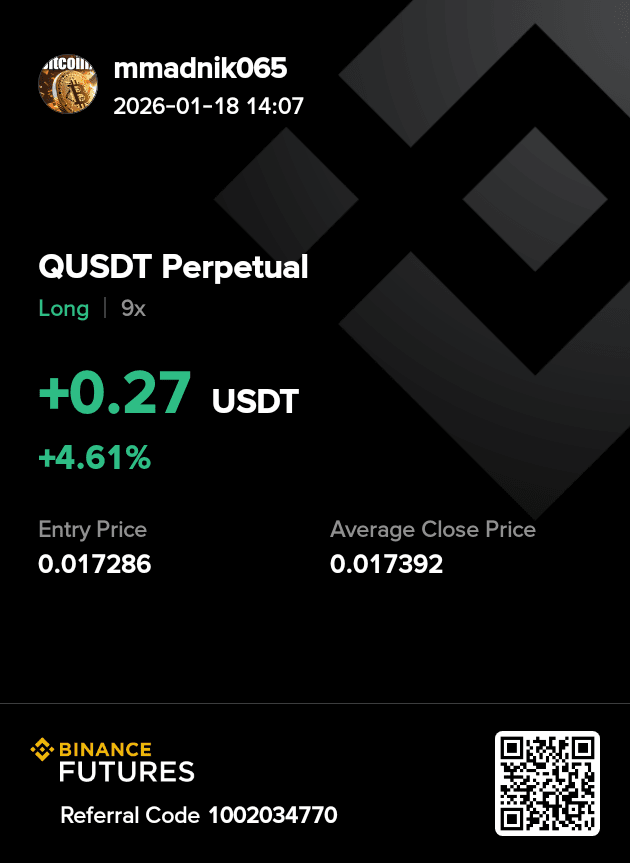 Hôm nay, tôi lại thử cùng một đồng tiền, cùng một thiết lập, nhưng lần này tôi đã kiên nhẫn. Tôi để giao dịch diễn ra, và Q cuối cùng đã tăng lên như mong đợi. Sử dụng đòn bẩy 9x, tôi đã chốt lời ở mức +4.61% ROI, 0.27 USDT. Gấp đôi lợi nhuận và cảm giác còn tốt hơn vì tôi đã tin tưởng vào thiết lập và áp dụng những bài học đã học. Bạn có thể kiểm tra chi tiết trong bức ảnh này.