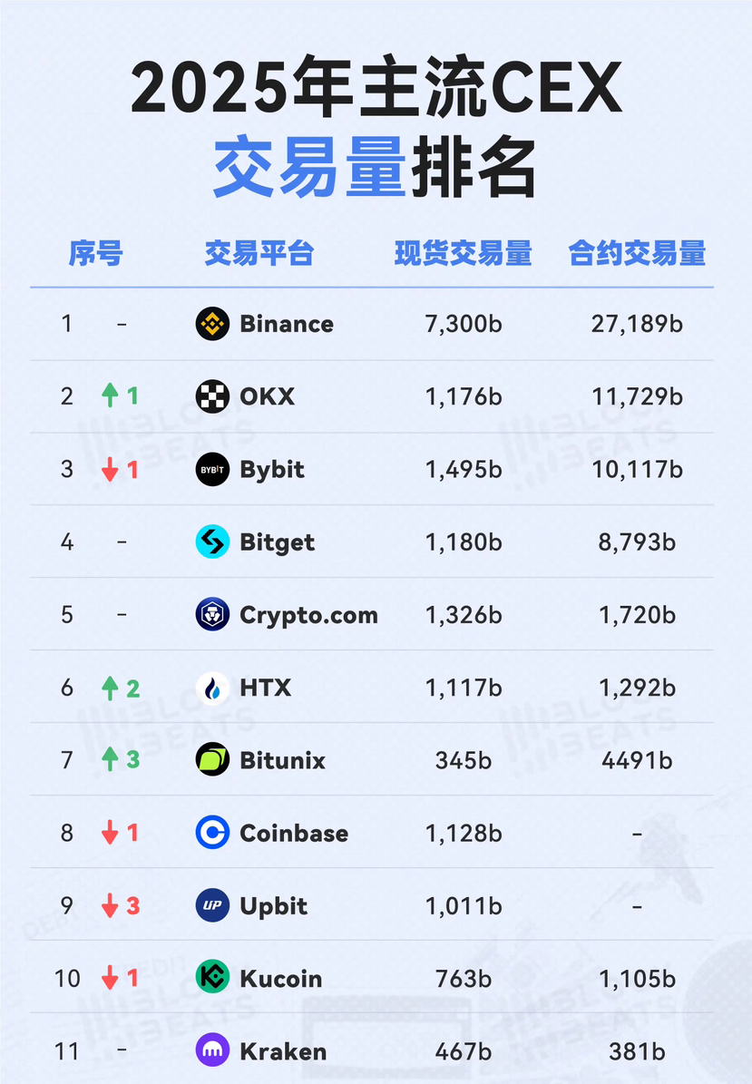 2025 năm CEX khối lượng giao dịch giao ngay tuy có sự hồi phục nhẹ, nhưng cấu trúc của thị trường tiền điện tử vẫn không thay đổi - vị trí thống trị của Binance vẫn vững chắc như núi Thái Sơn! Dữ liệu mới nhất cho thấy, thị phần thị trường giao ngay của Binance đã trực tiếp tăng lên 40.7%, khối lượng giao dịch trong 24 giờ đạt 100.43 tỷ USD, bỏ xa vị trí thứ hai gần 5 lần, hoàn toàn dẫn đầu.