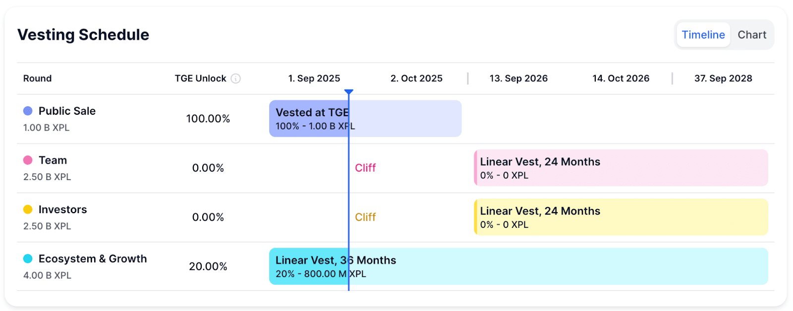 Mở khóa: 20% tại TGE (0.80 tỷ XPL), phần còn lại được phát hành theo thời gian