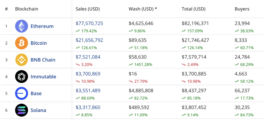 Ethereum dẫn đầu với 77,6 triệu đô la trong doanh số, tăng 179%, trong khi Bitcoin tăng 127% lên 21,7 triệu đô la.