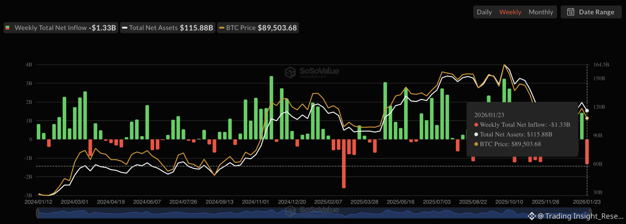 $BTC Chịu thiệt hại nặng nề nhất. Các quỹ ETF chứng kiến hơn 1.33 Tỷ USD bị rút ròng, mức tồi tệ nhất kể từ đợt bán tháo tháng 11.