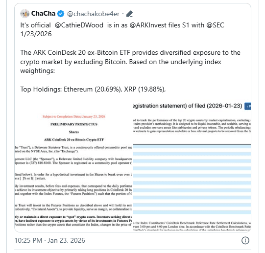 ARK Invest đã nộp đơn cho ETF Crypto CoinDesk 20 của ARK, một sản phẩm được thiết kế để theo dõi Chỉ số CoinDesk 20, đại diện cho các tài sản kỹ thuật số lớn nhất và có tính thanh khoản cao nhất trên thị trường. Chỉ số này không bao gồm stablecoin, memecoin và token tập trung vào quyền riêng tư, thay vào đó tập trung vào các tài sản có quy mô, chiều sâu và sự liên quan đến thể chế.