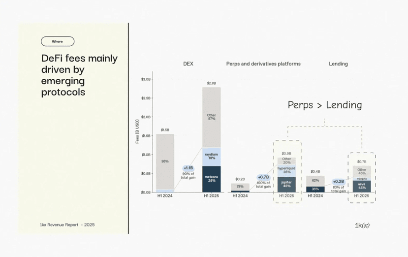 Dữ liệu doanh thu phản ánh rõ ràng sự chuyển dịch này. Vào năm 2024, các sản phẩm phái sinh trên chuỗi tạo ra ít phí hơn rất nhiều so với cho vay. Đến năm 2025, phí Perp DEX đã tăng vọt một cách đáng kể, vượt qua cho vay không phải vì nhiều vốn bị khóa lại, mà vì vốn đang di chuyển nhanh hơn. Biến động, một lần là yếu tố rủi ro, trở thành đầu vào trực tiếp cho doanh thu.